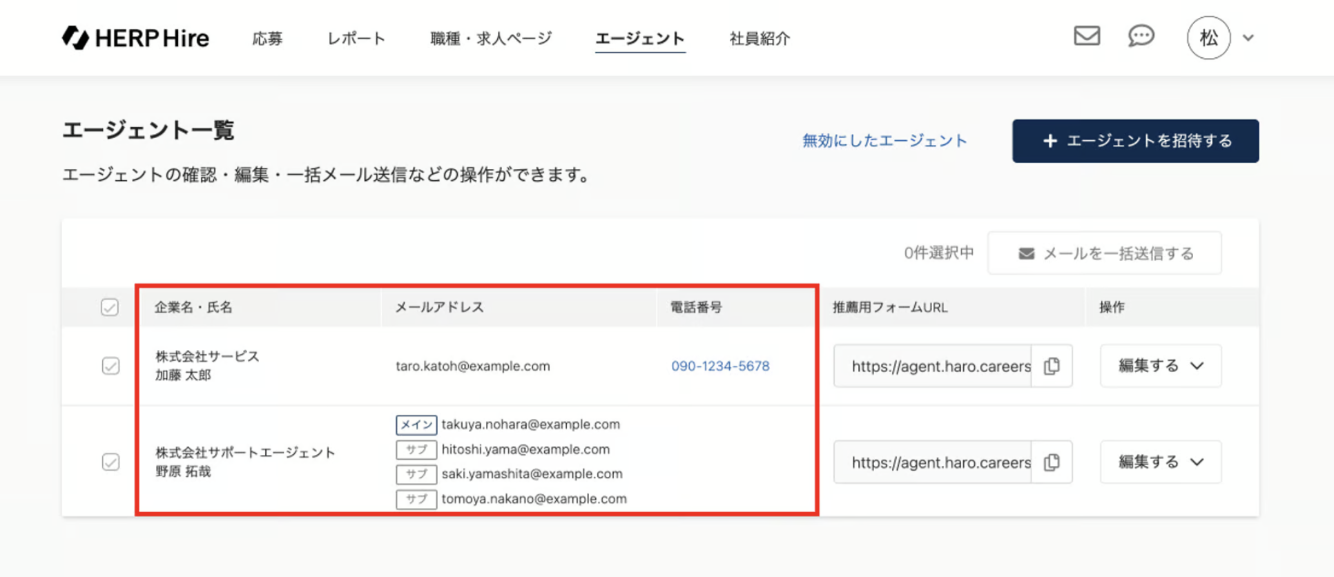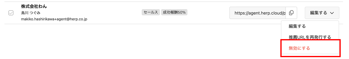エージェントを無効にすると、当該エージェントはHERP Hireにアクセスできなくなり、職種情報、応募者情報等すべて見ることができなくなります。