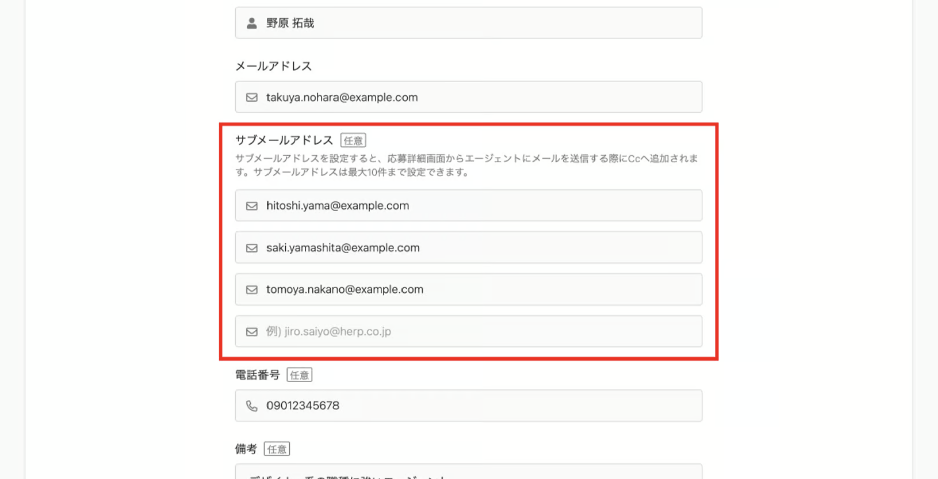 招待したエージェントに対して、メインのメールアドレスのほか、サブメールアドレスを設定することで、サブメールアドレス宛てにCcでメールが送信できます。複数の担当者がいるエージェントの管理やコミュニケーションにご利用ください。