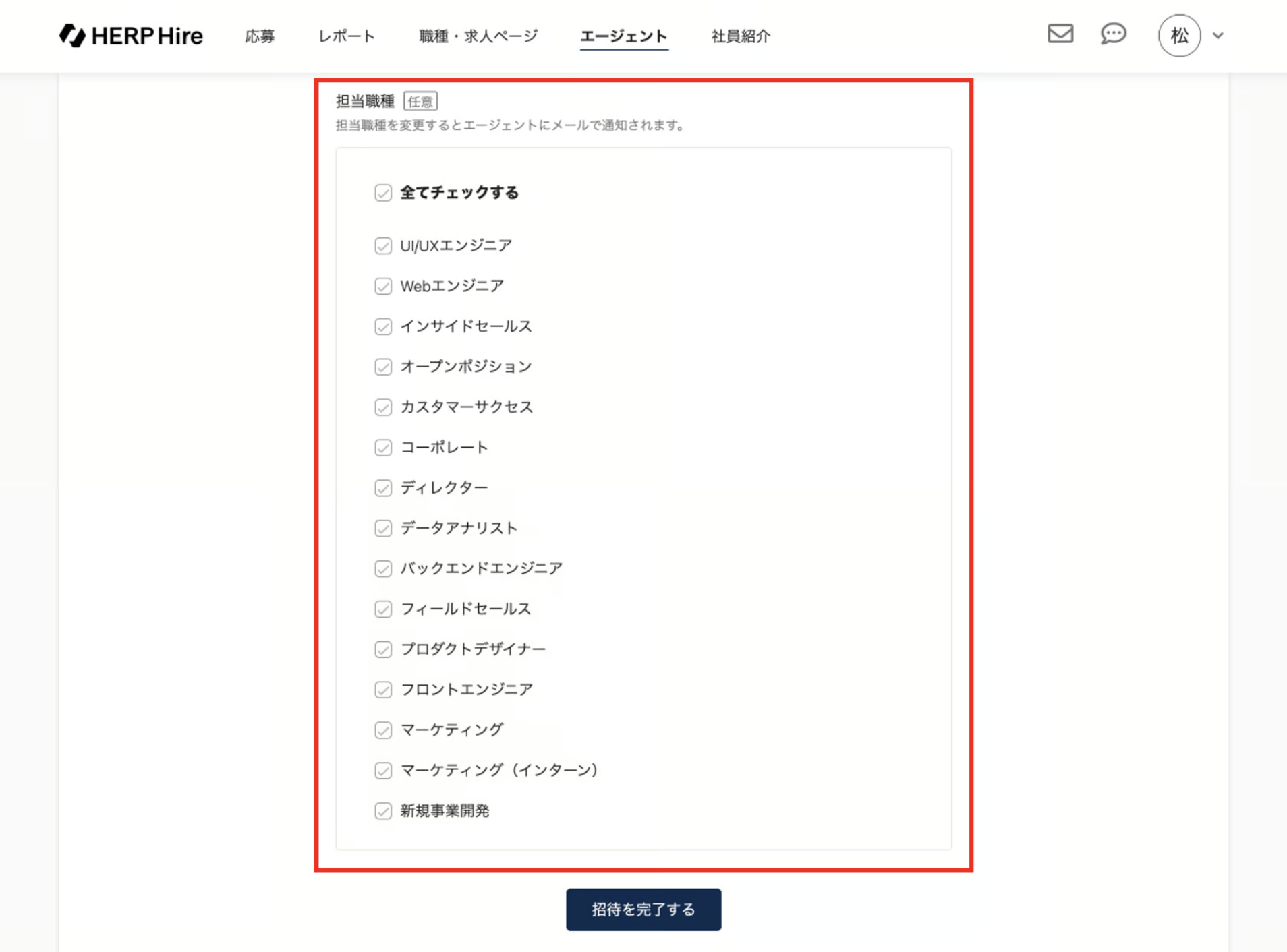 こちらで、エージェントが推薦可能な担当職種を登録することができます。全ての職種を一括でアサインしたり、複数の職種を選択してアサインすることも可能です。