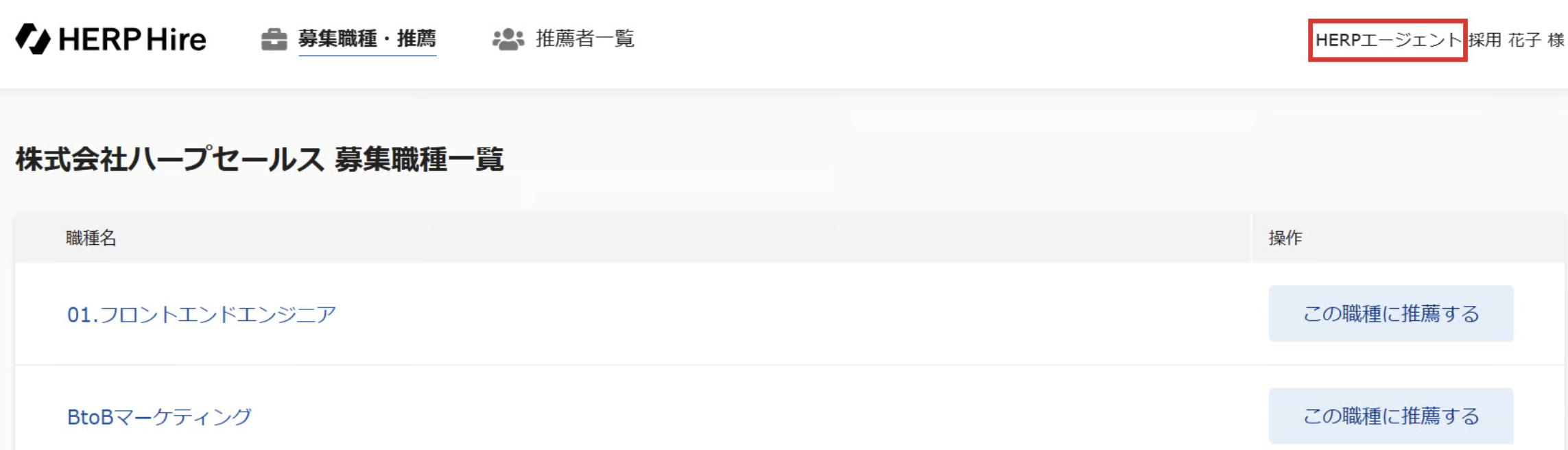 エージェント側のHERP Hire画面上に、エージェントの企業名が表記されます。