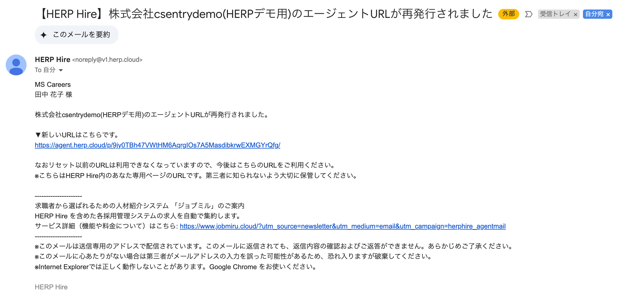 再発行すると、エージェントに再発行した URLがメールで届きます。
