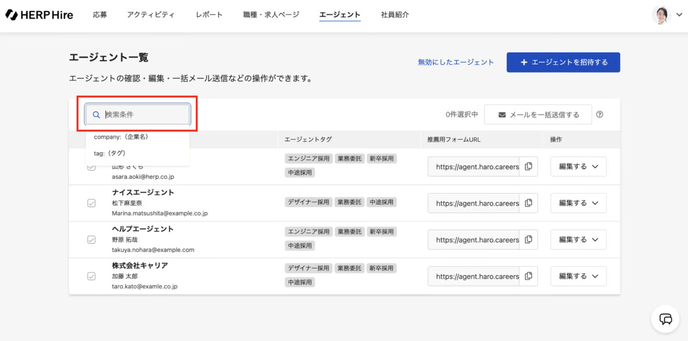 tag:(タグ)をクリックの上、タグの一部を入力する検索条件なしでキーワードのみを入力すると、エージェント企業名・エージェントタグのいずれかに部分一致するエージェントが存在する場合に、該当のエージェントが一覧に表示される