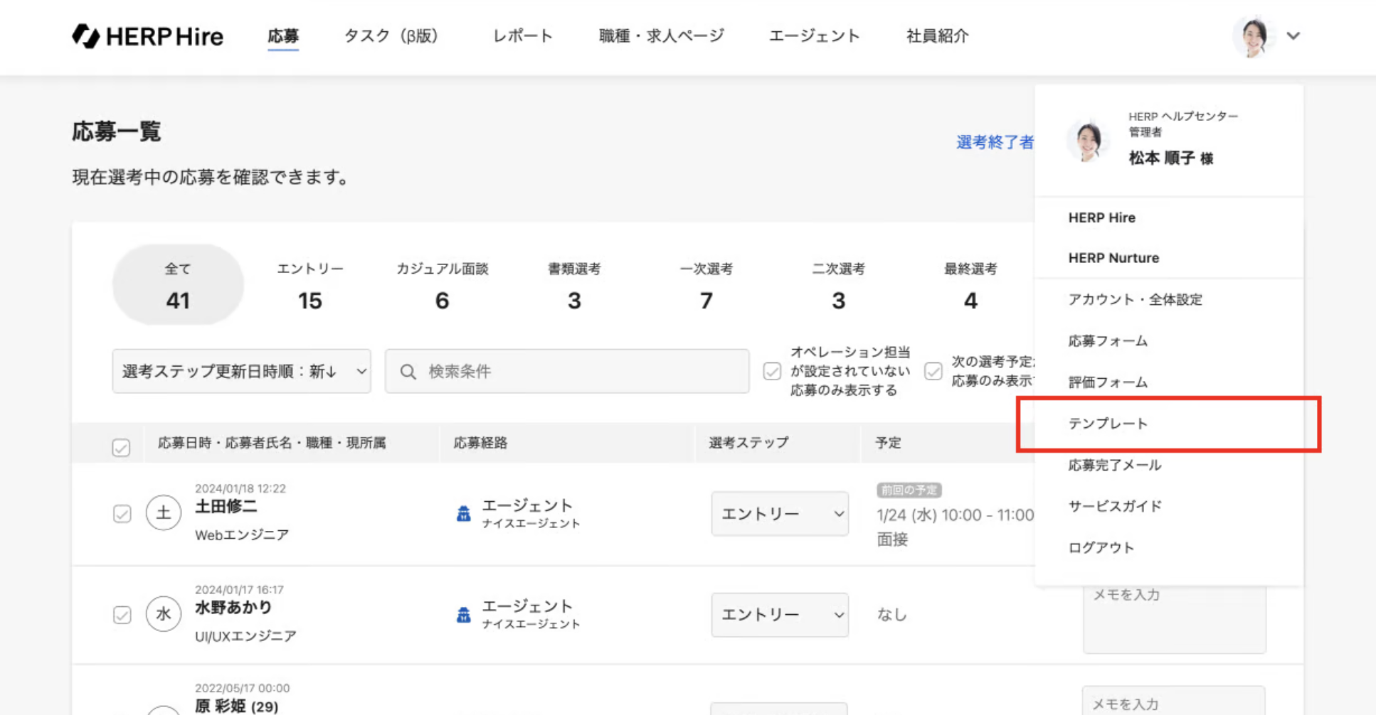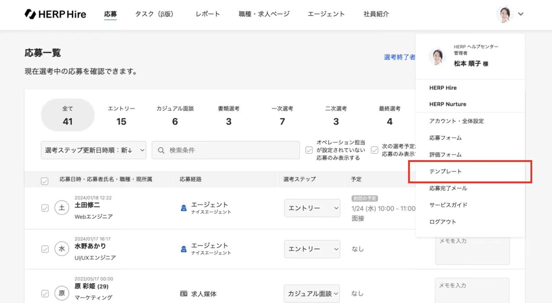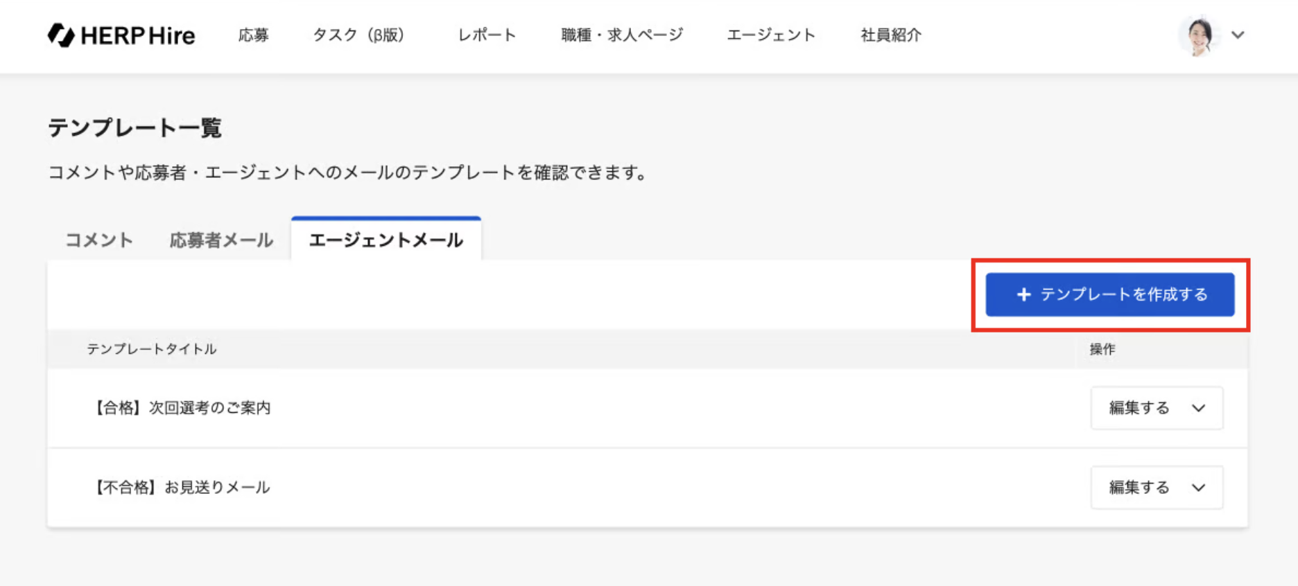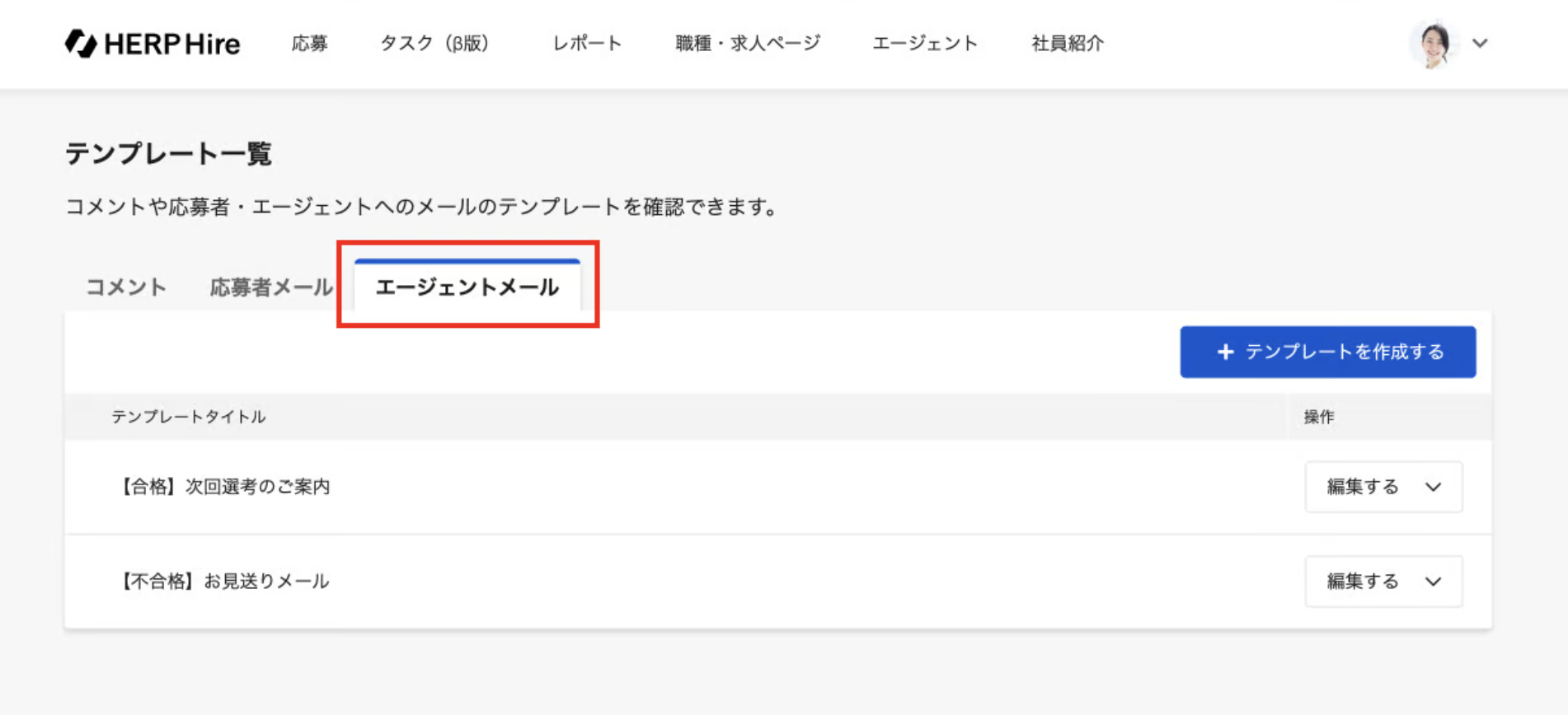 右上のアバターをクリックし、「テンプレート設定」からエージェントメールのタブをクリックします。