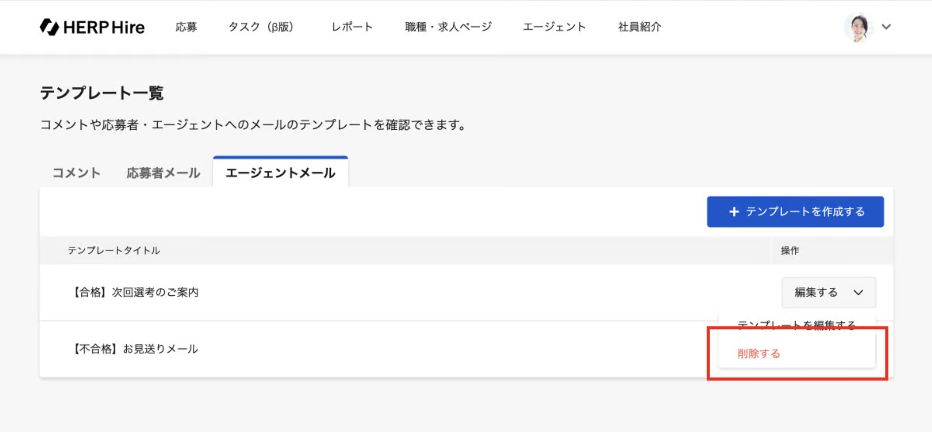 「エージェントメール」タブをクリックします。削除したいエージェントメールテンプレートの「編集する」をクリックし、表示されたリストから「削除する」をクリックします。