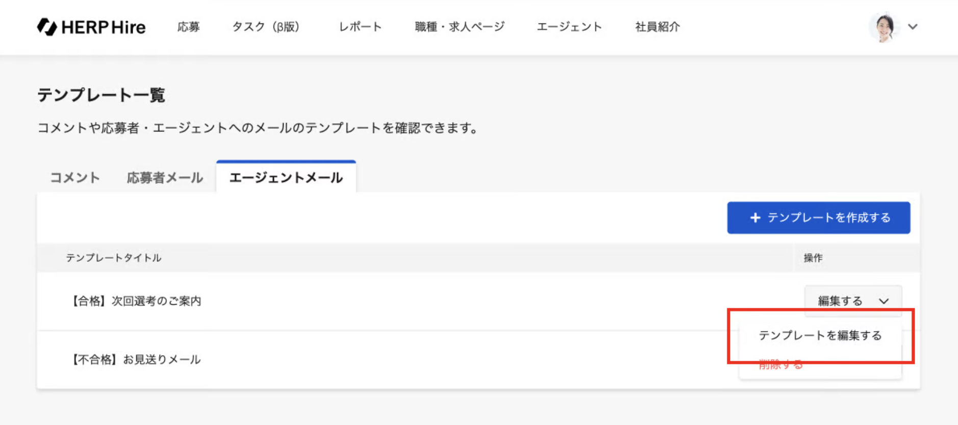 「エージェントメール」タブをクリックします。編集したいエージェントメールテンプレートの「編集する」をクリックし、表示されたリストから「テンプレートを編集する」をクリックします。