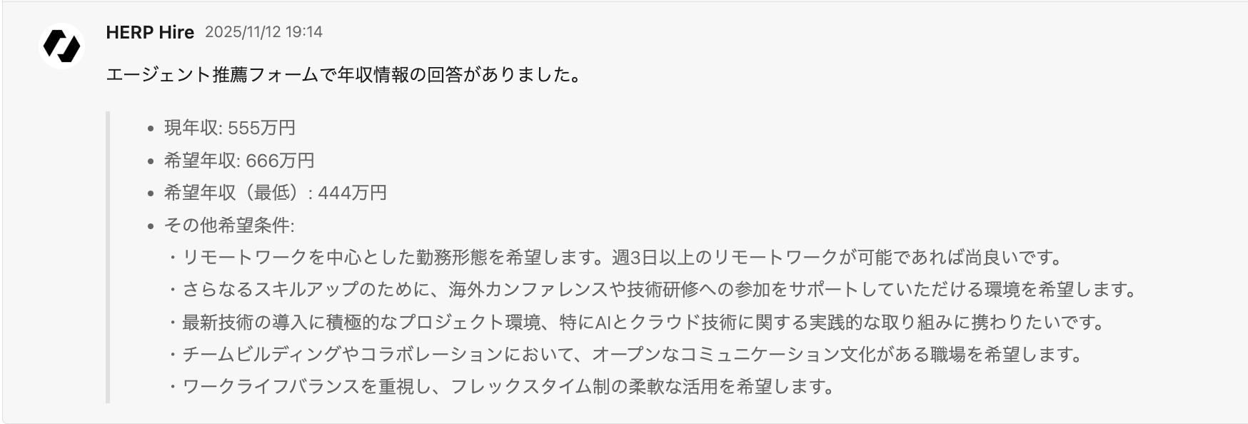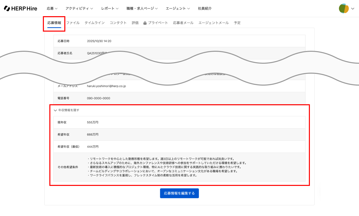 現年収、希望年収、希望年収(最低)、その他希望条件の4項目はエージェント推薦フォームのみにある項目です。回答は応募情報タブの年収情報、およびプライベートタブへの投稿から確認可能です。