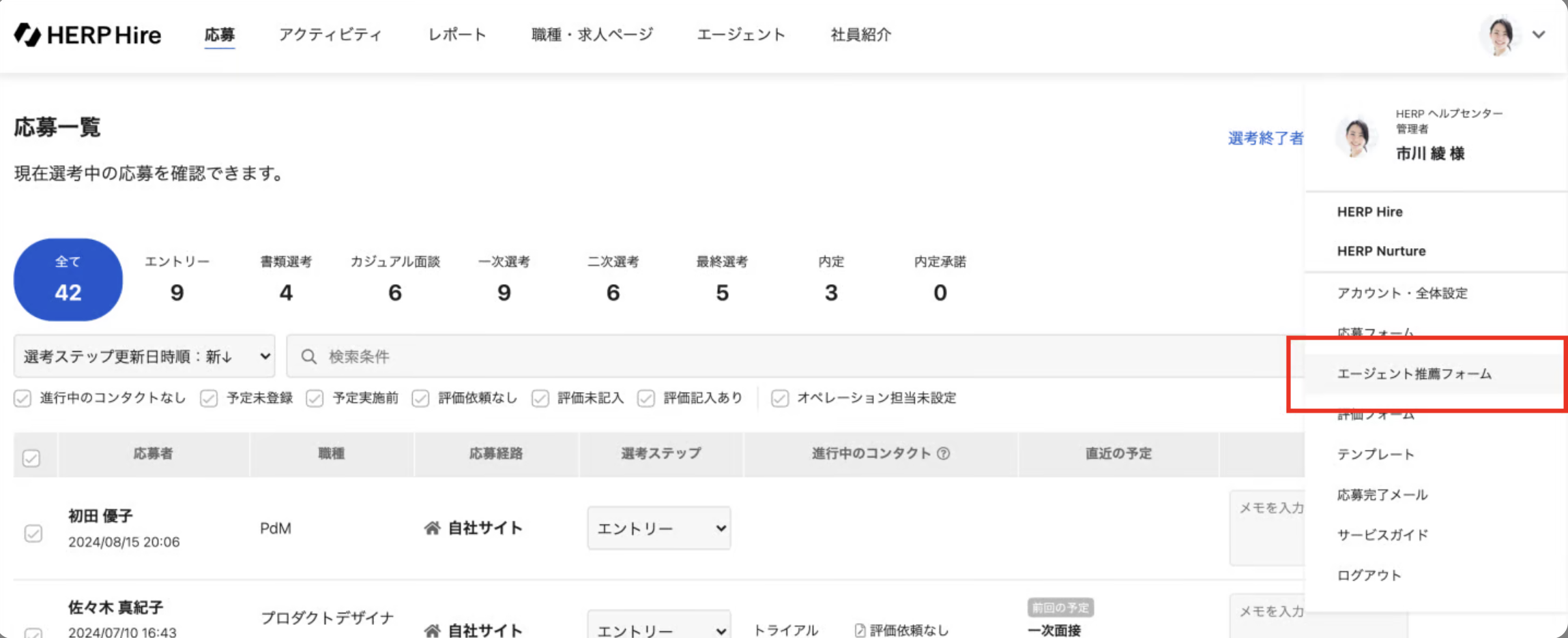右上のアバター(アイコン)をクリックし、メニューから「エージェント推薦フォーム」をクリック