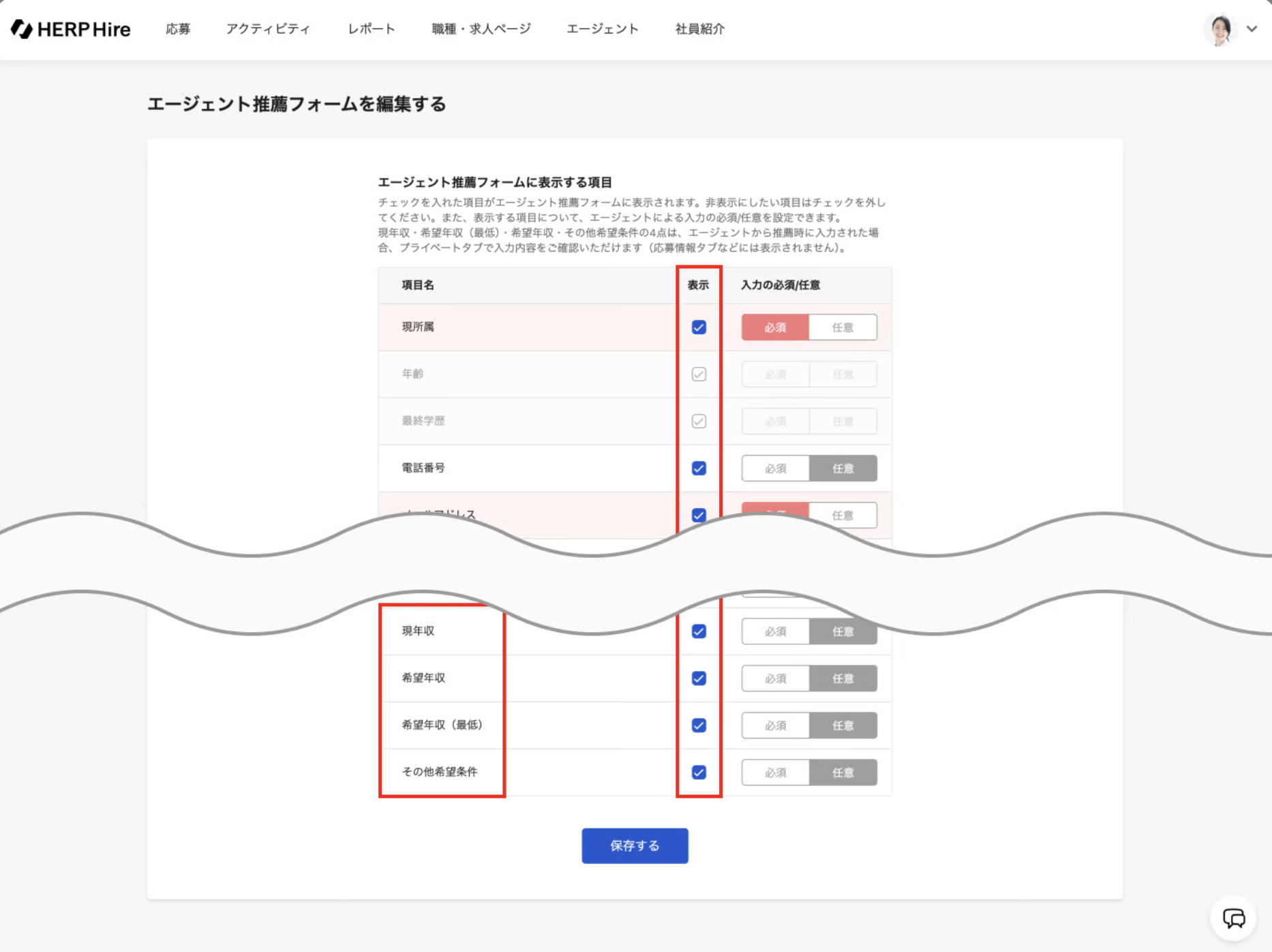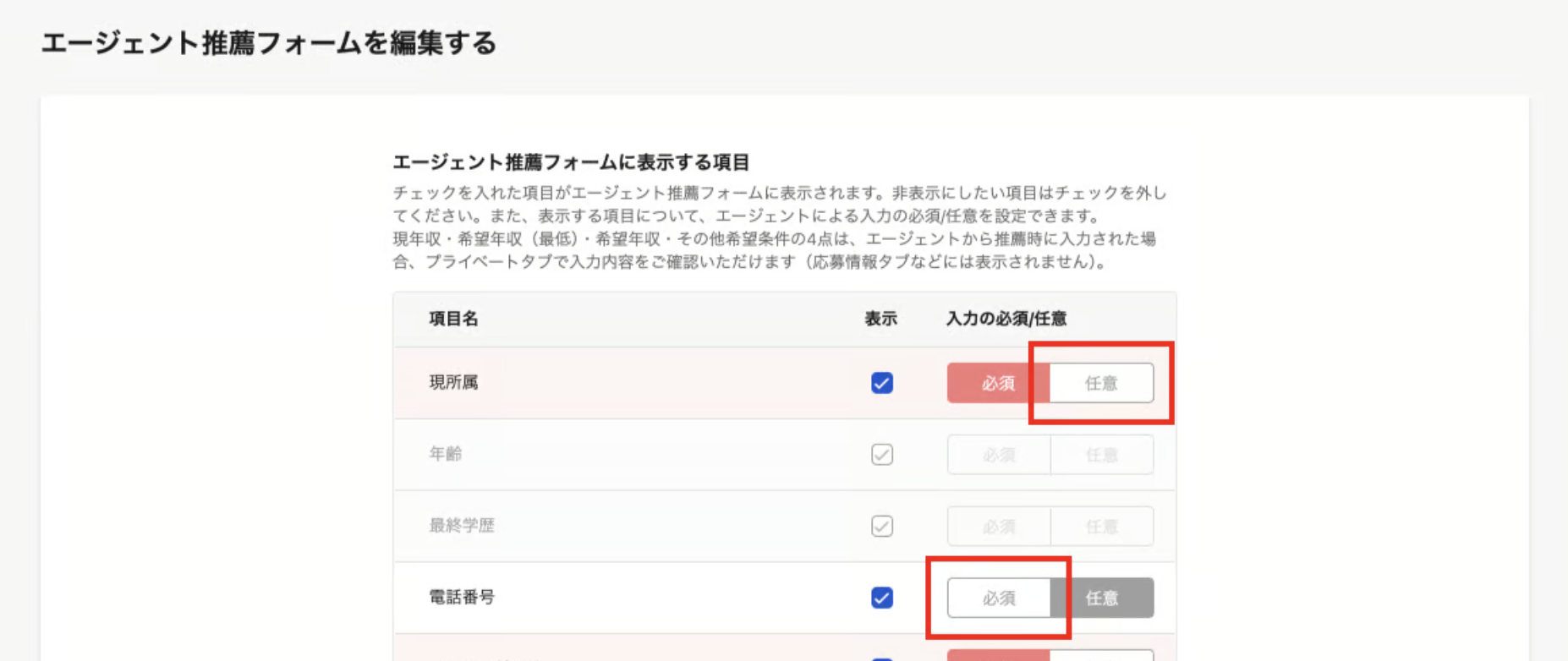 エージェント推薦フォームに表示したい項目にチェックを入れる(表示したくない項目はチェックを外す)