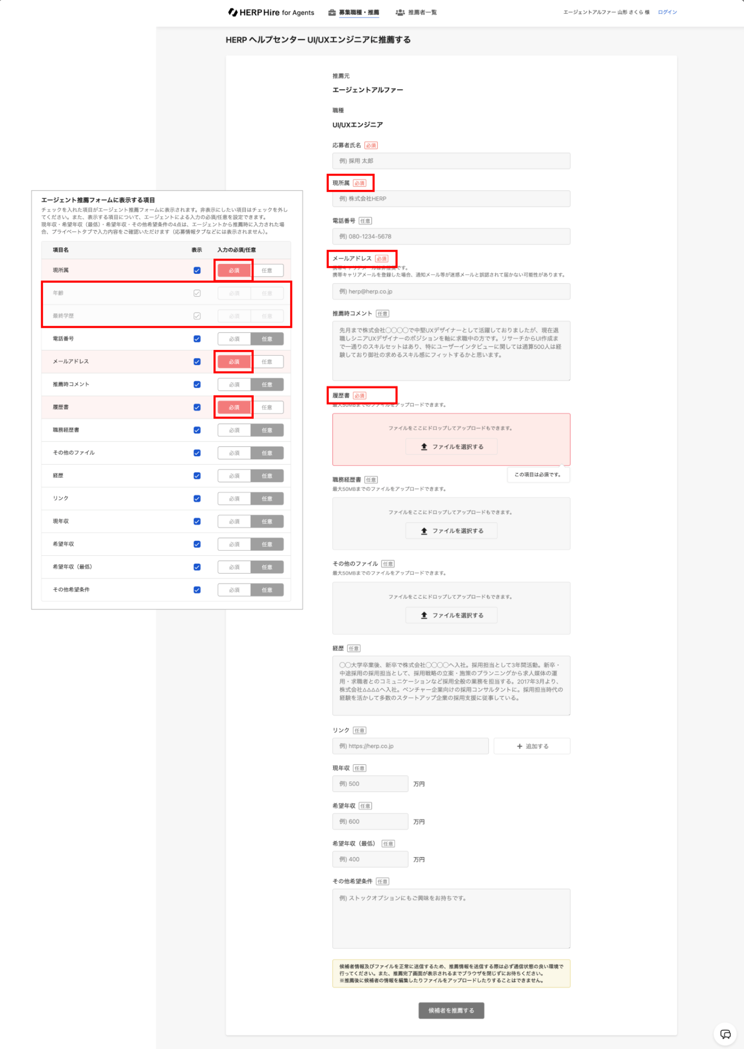 ここで設定いただいた項目は、エージェントが推薦する際のフォームに下記のように反映されます。