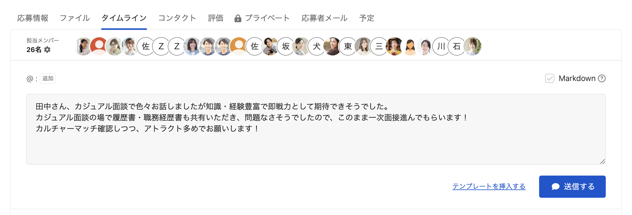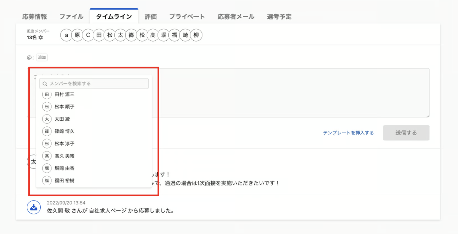 応募詳細の「タイムライン」タブをクリックします。コメントを入力し、「送信する」をクリックしてコメントを送信します。