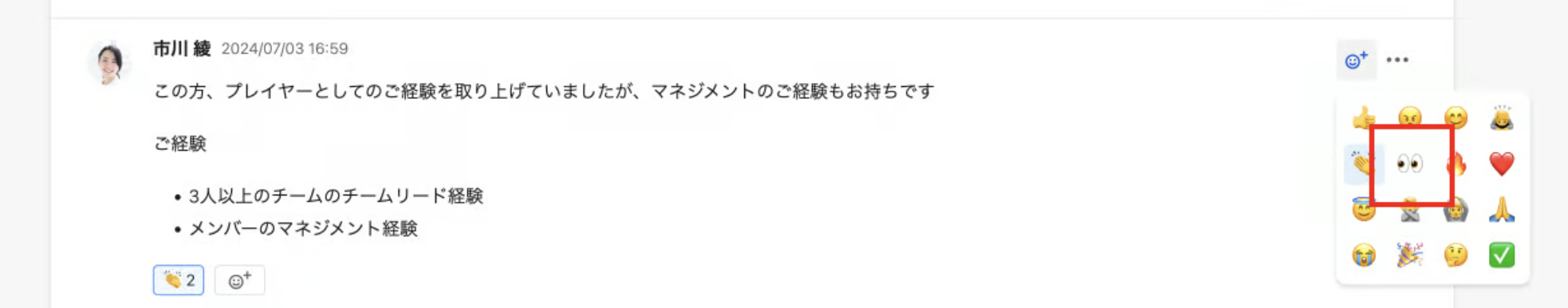 タイムラインコメントに絵文字でリアクションすることができます。