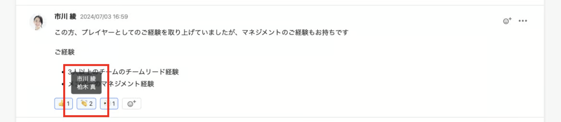 リアクションにカーソルを合わせると、リアクションを追加したユーザーのユーザー名が表示されます。