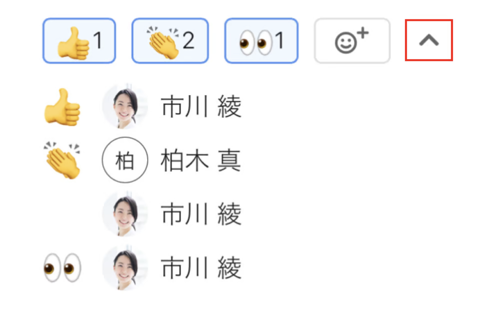 リアクションの右部にある「∨」をタップすると、リアクションを追加したユーザーのユーザー名が一覧で表示されます。