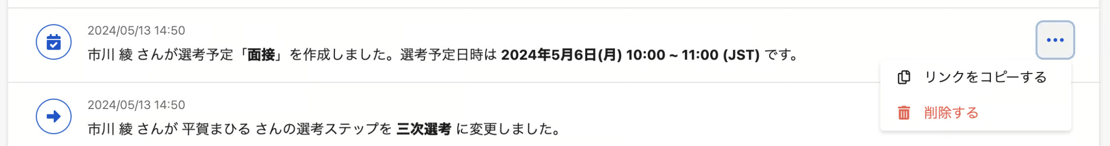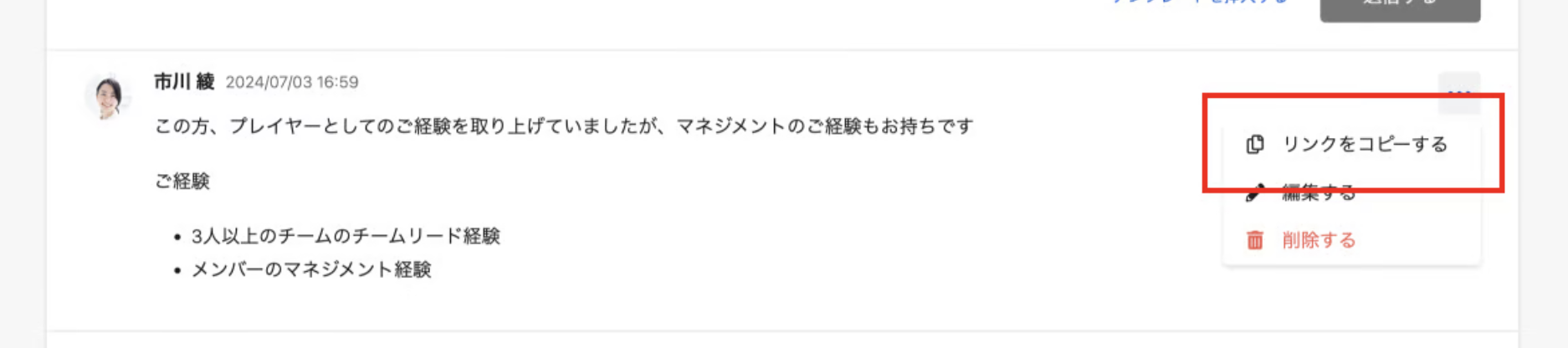 応募詳細の「タイムライン」タブで、コメントにホバーして「…」の「リンクをコピー」をクリック