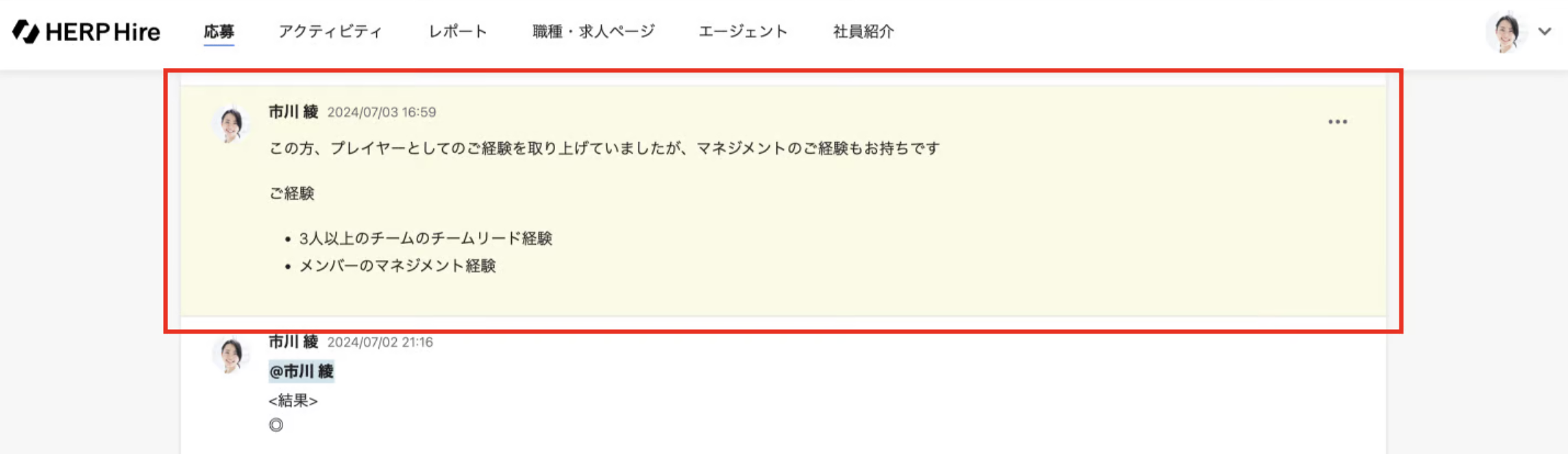 リンクにアクセスすると、応募詳細ページ内で自動でスクロールされ、当該投稿が最上部に表示され、黄色くハイライトされる