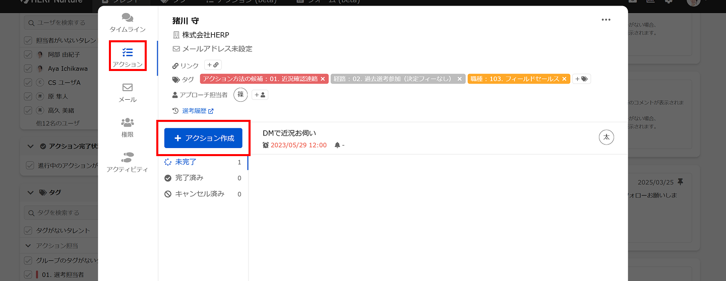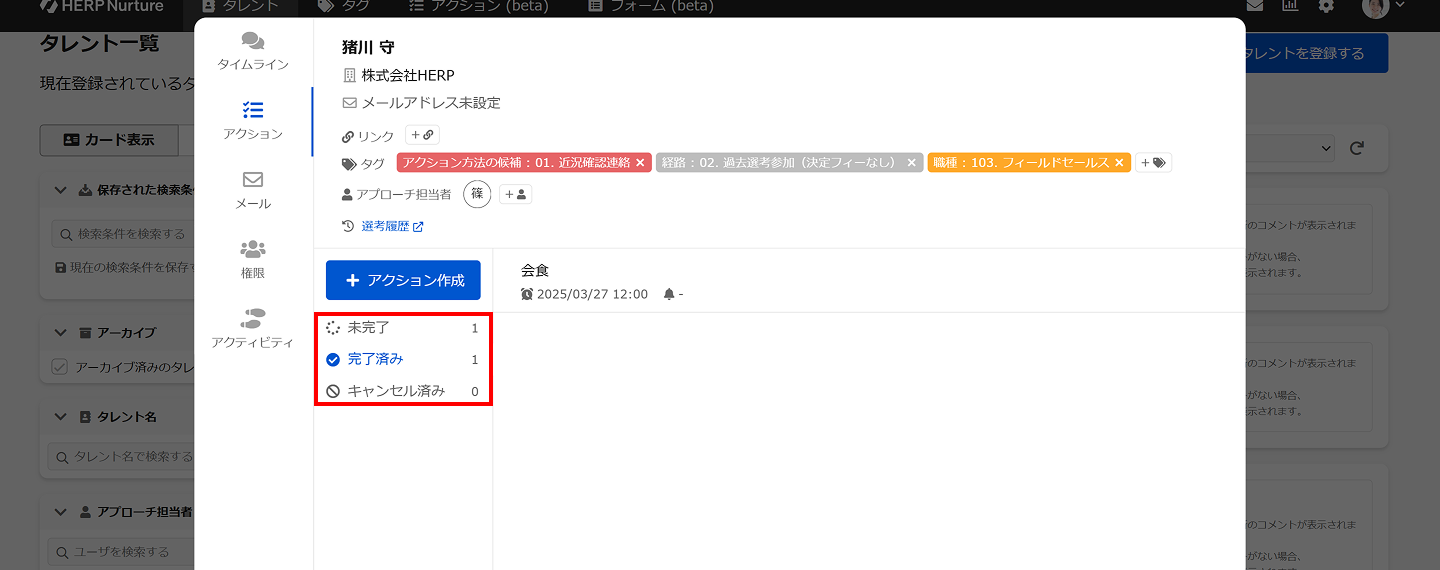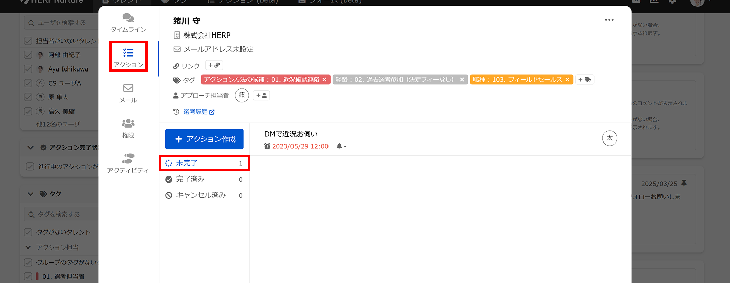 左メニューから「アクション管理」を選択しタレントに関する未完了のアクションを一覧で確認