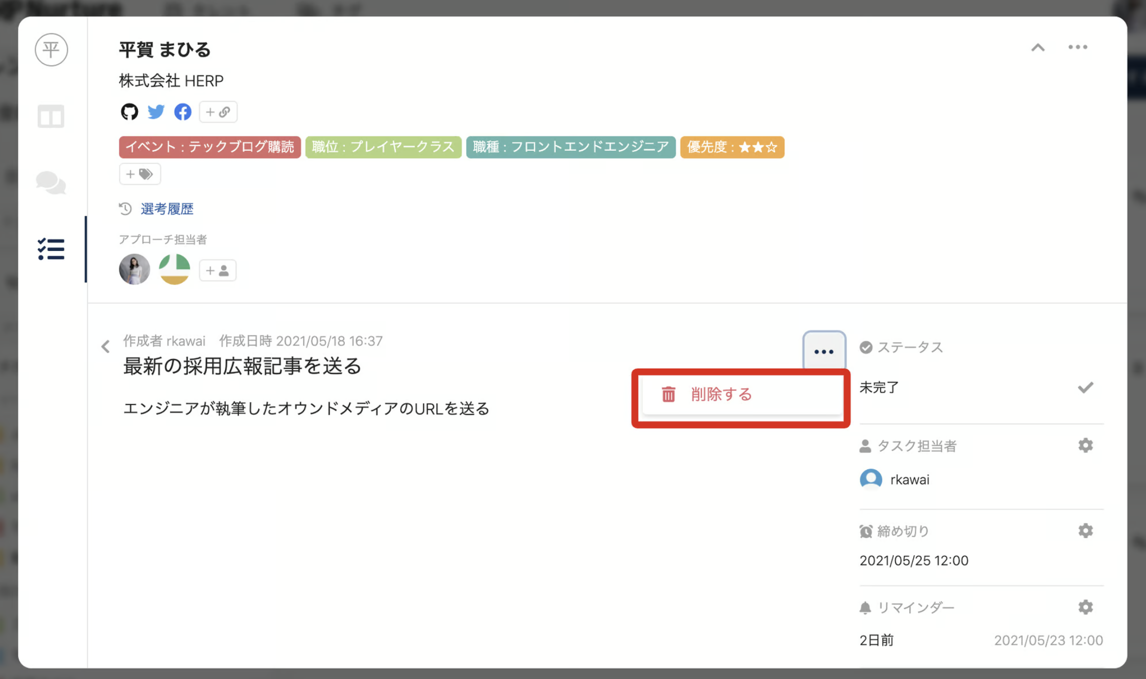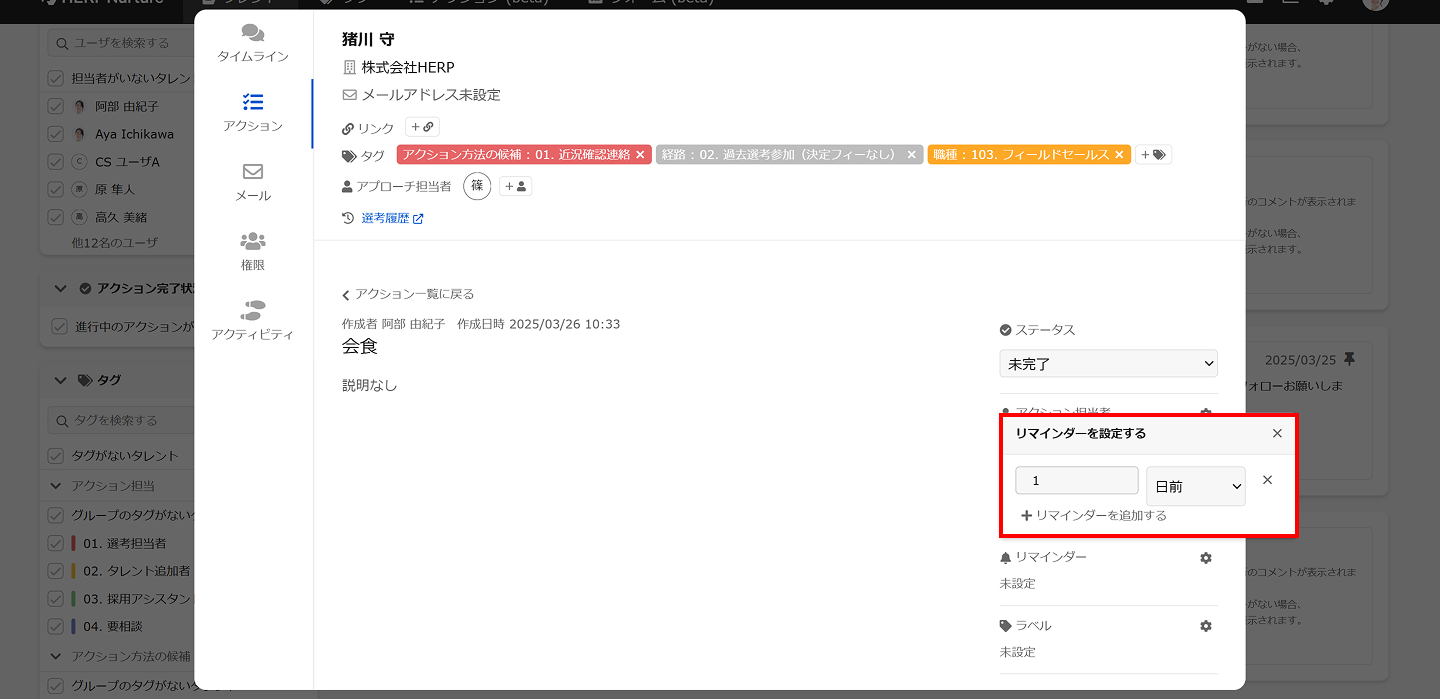 アクションの締め切りを設定するとリマインドが設定できるようになります
