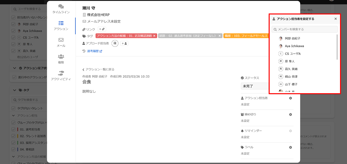 既に設定されているアクション担当者を外したい場合はもう一度クリックするとアサインが外れます