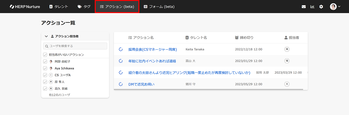 未完了のアクションは締め切りの近い順に表示され、アクション担当者ごとに絞り込みが可能です。