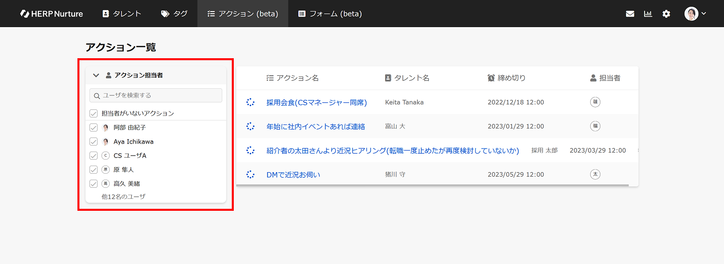 「アクション担当者」よりアクションの担当者ごとに絞り込みが可能です。