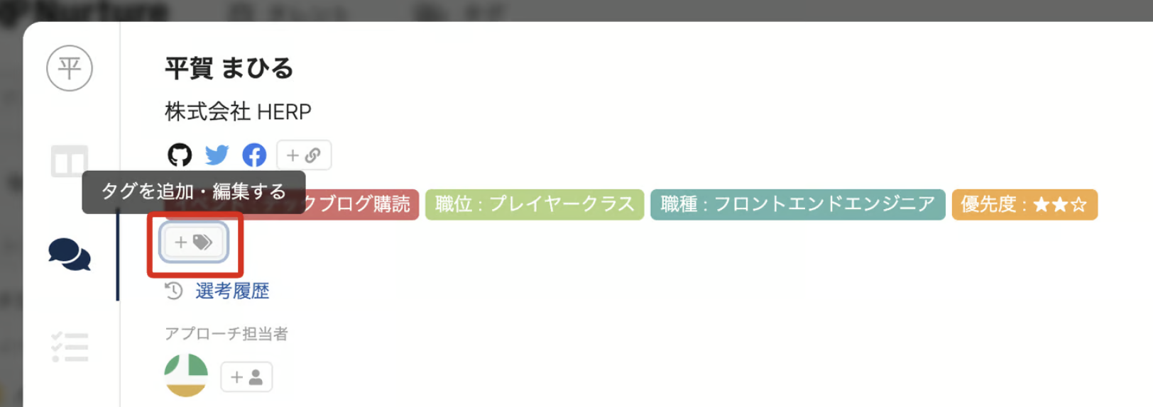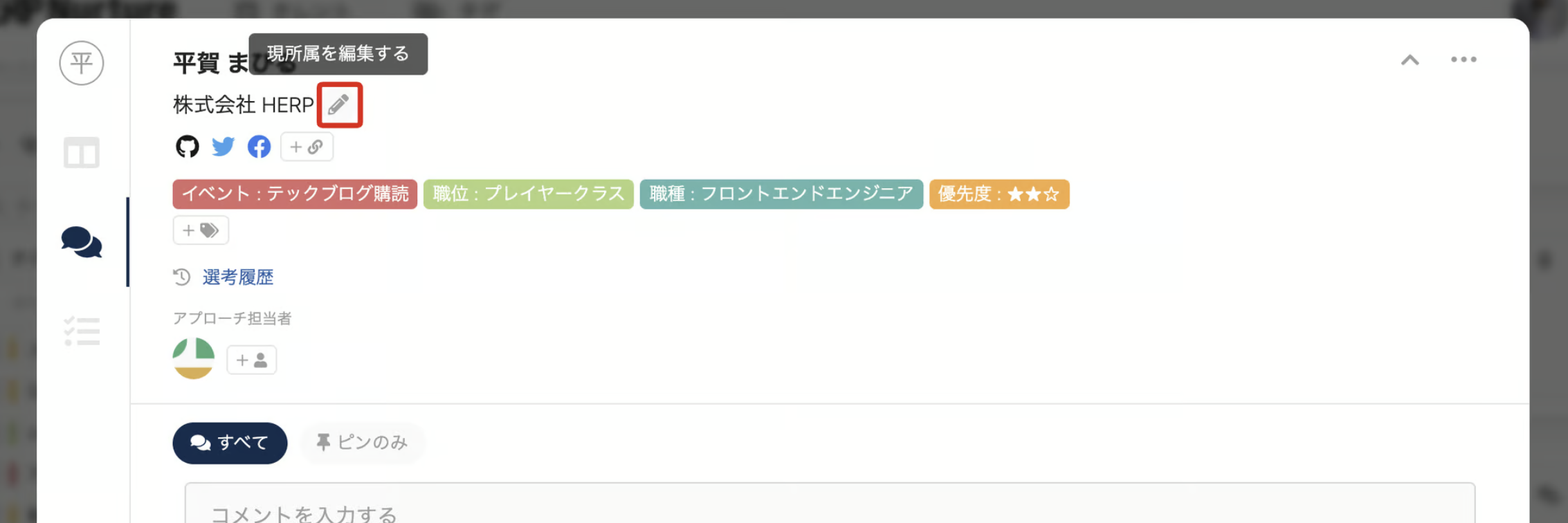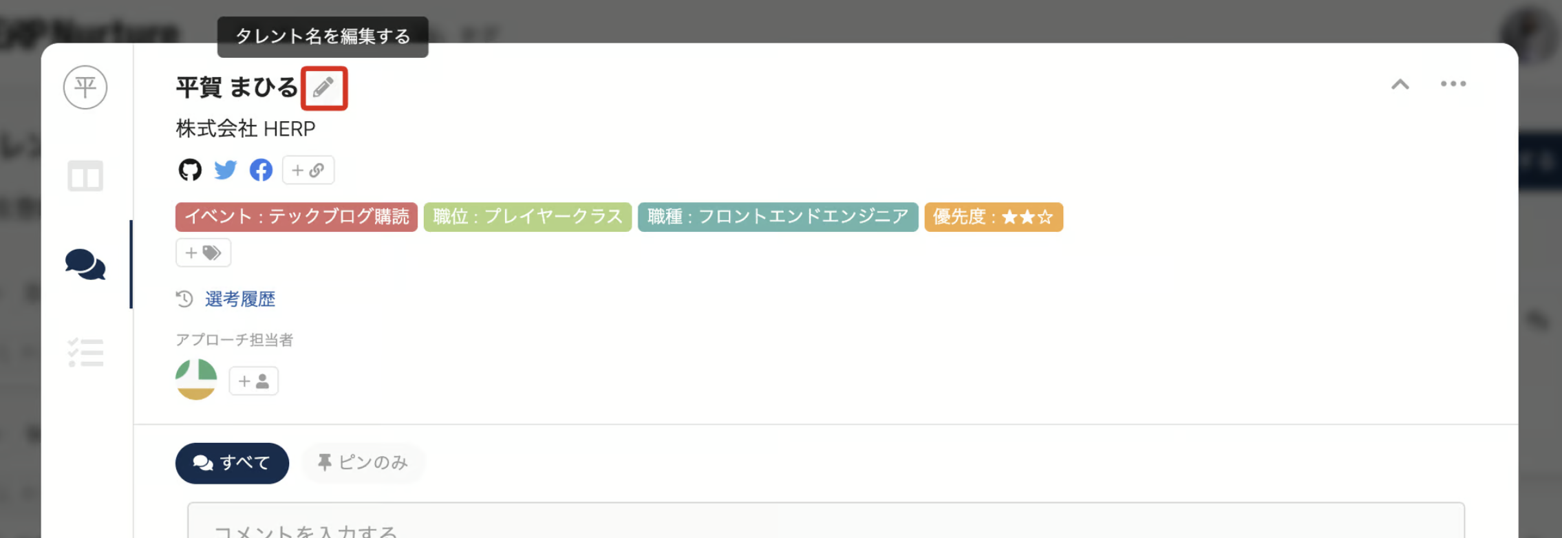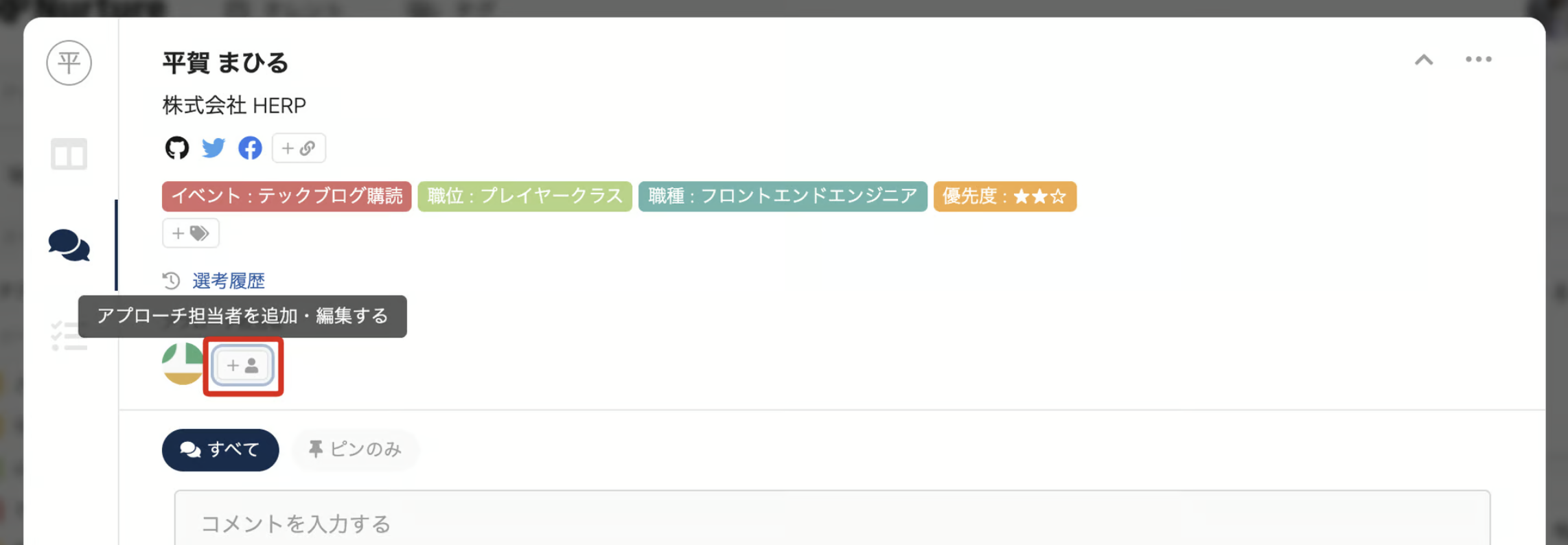 HERP Nurture では、タレントへの窓口となるアプローチ担当者をタレントごとに設定することができます。アプローチ担当者を設定いただくと、担当者ごとに絞り込みができたり、そのタレントへのコメントがアプローチ担当者にDMで通知されるようになるので、アプローチ担当者が効率的にタレントの管理を行うことができます。