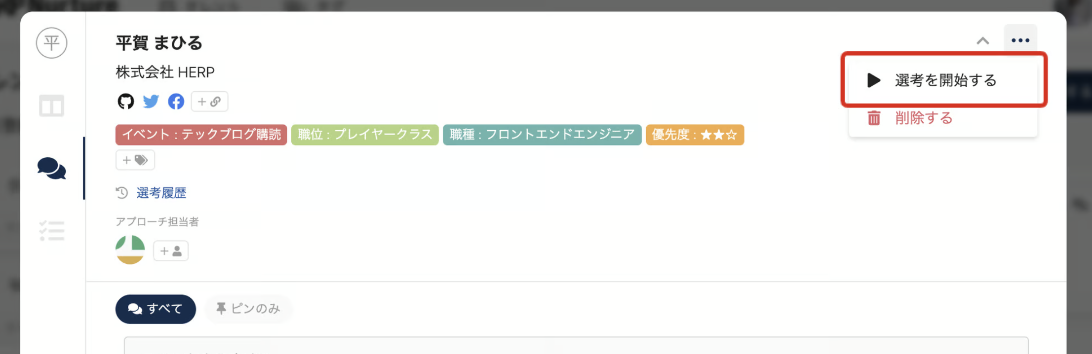 登録していたタレントが選考を受けることになった場合、HERP Nurture上で選考を開始することで、 HERP Nurture に登録したタレントの情報をHERP Hire上の応募情報として引き継ぐことができます。