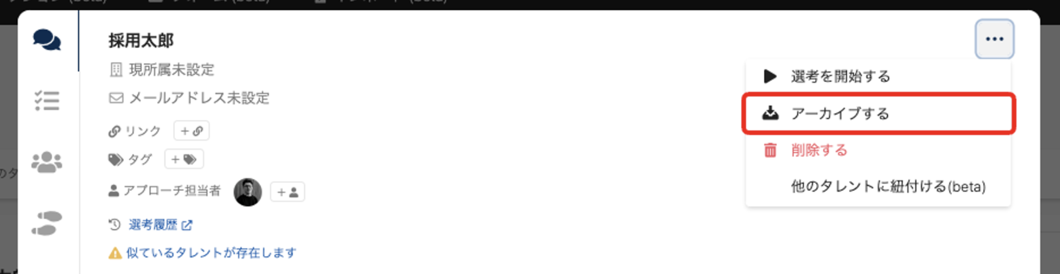 アーカイブしたいタレントの詳細画面の右上の「…」ボタンから、「アーカイブする(beta)」をクリックします。