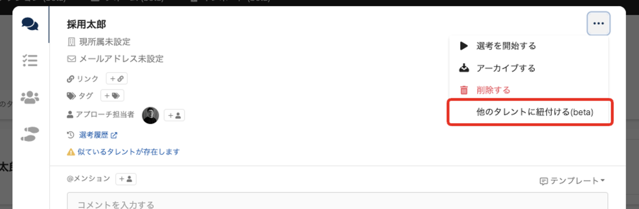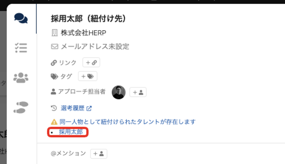 社内の別々のメンバーから同一人物がタレントとして登録された場合や、すでにタレントとして存在する候補者がHERP Hireに別経路で応募してきた場合などにご利用ください。