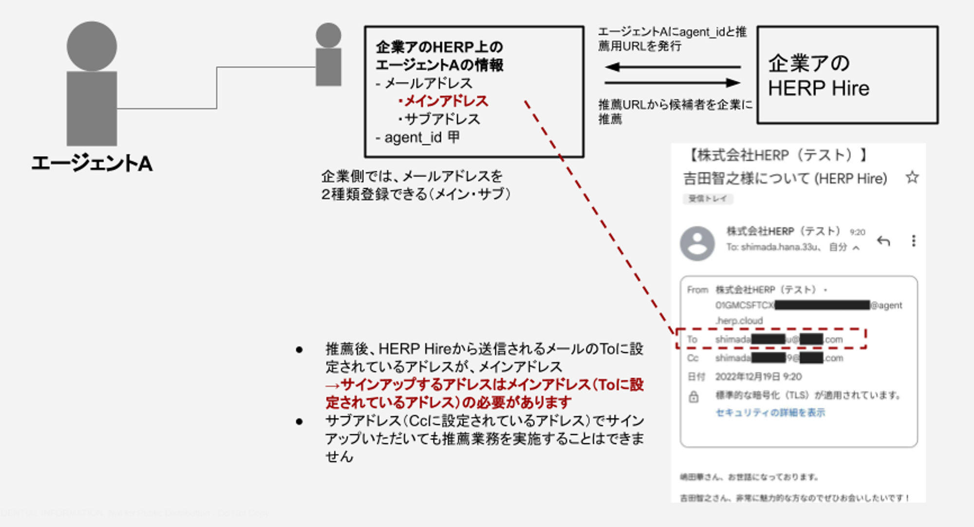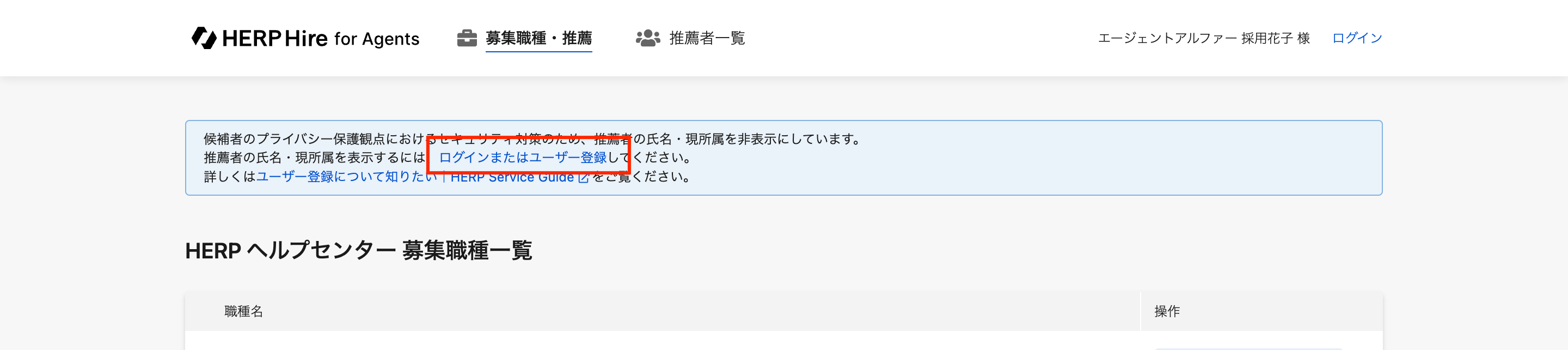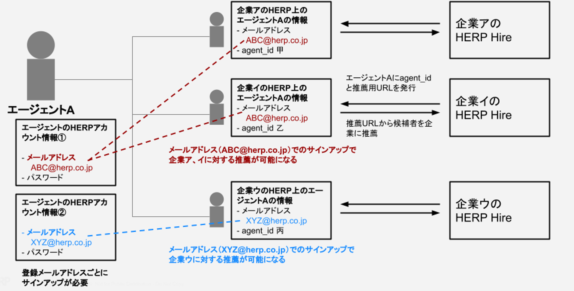 推薦先企業にHERP Hire for Agentsで招待されたメールアドレス(HERP Hire for Agents から送信されるメールのTOに設定されているメールアドレス)と、貴社側でユーザー登録するアカウントのメールアドレスが一致している必要があります。