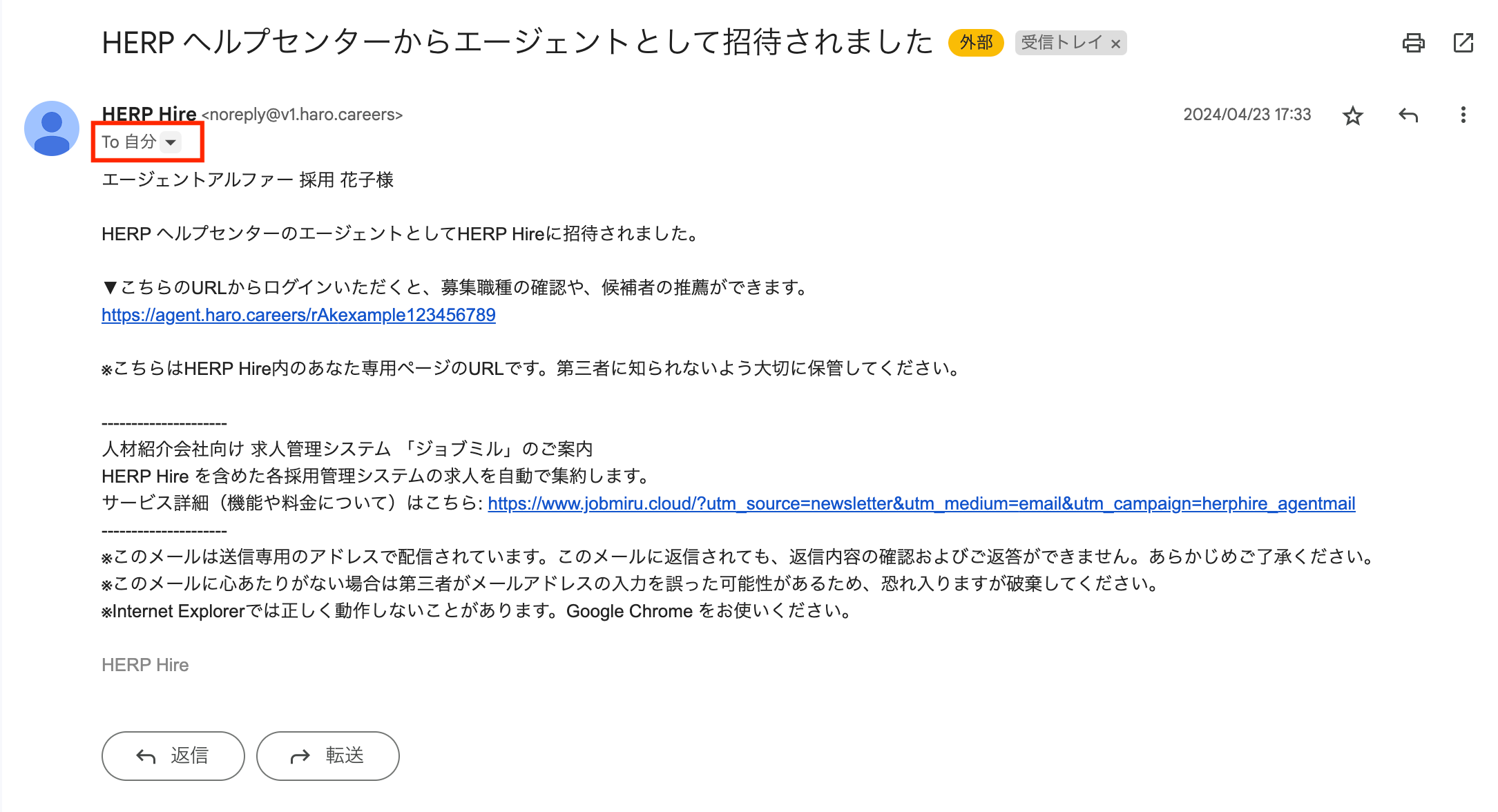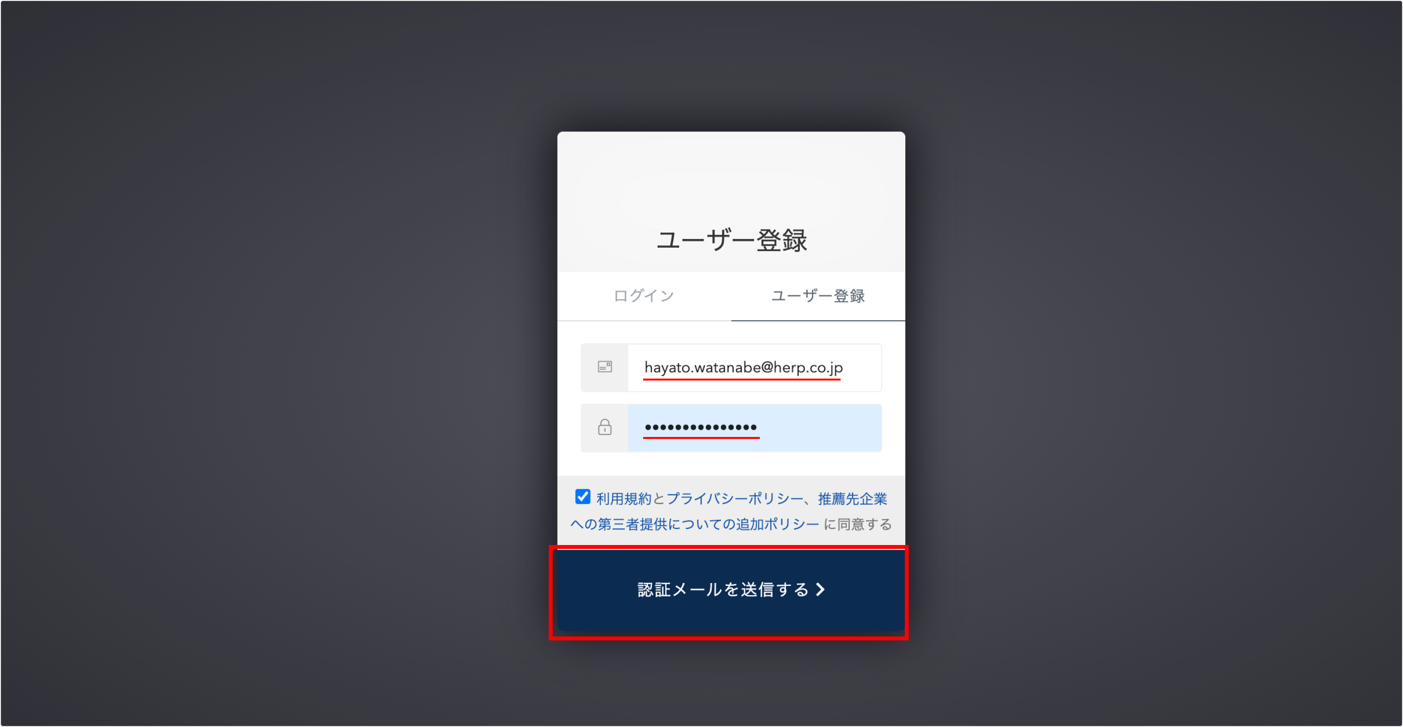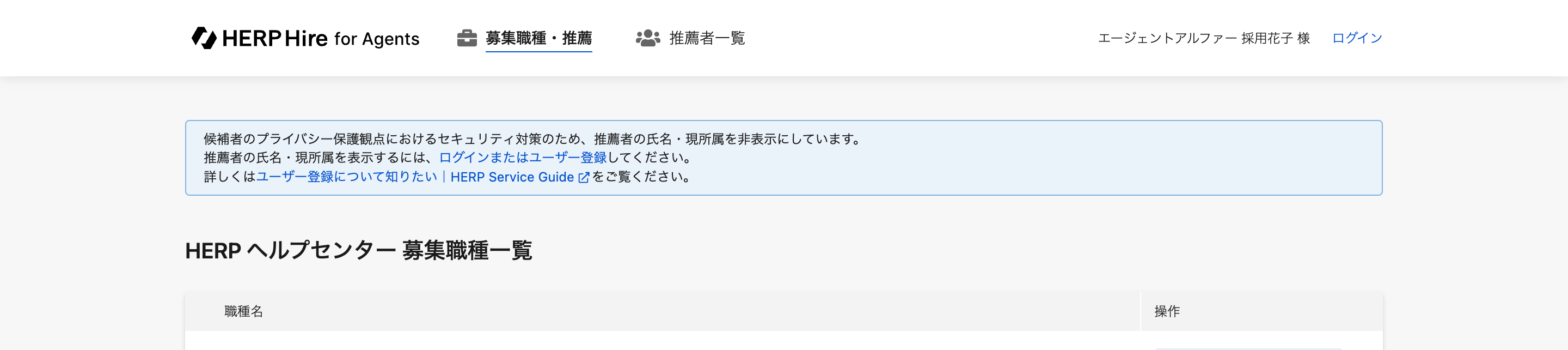 推薦先企業にHERP Hire for Agentsで招待されたメールアドレス(HERP Hire for Agents から送信されるメールのTOに設定されているメールアドレス)と、貴社側でユーザー登録するアカウントのメールアドレスが一致している必要があります。