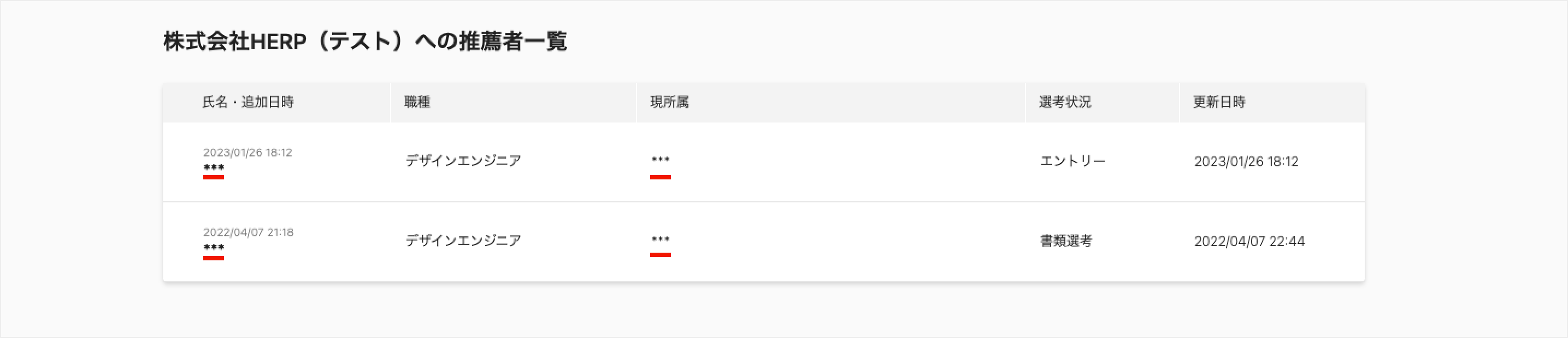 推薦者一覧において推薦者の氏名・現所属が表示されます