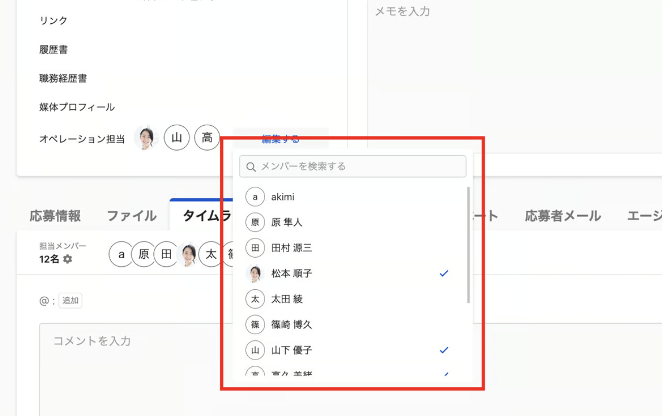 オペレーション担当は、この職種に紐づく応募の応募詳細にアクセスできるユーザーの中から選択することができます。