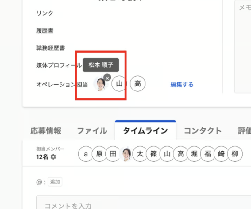 オペレーション担当は、管理者・リクルーター・アシスタント権限のユーザーのうち、この応募の閲覧権限を持つユーザーの中から選択することができます。