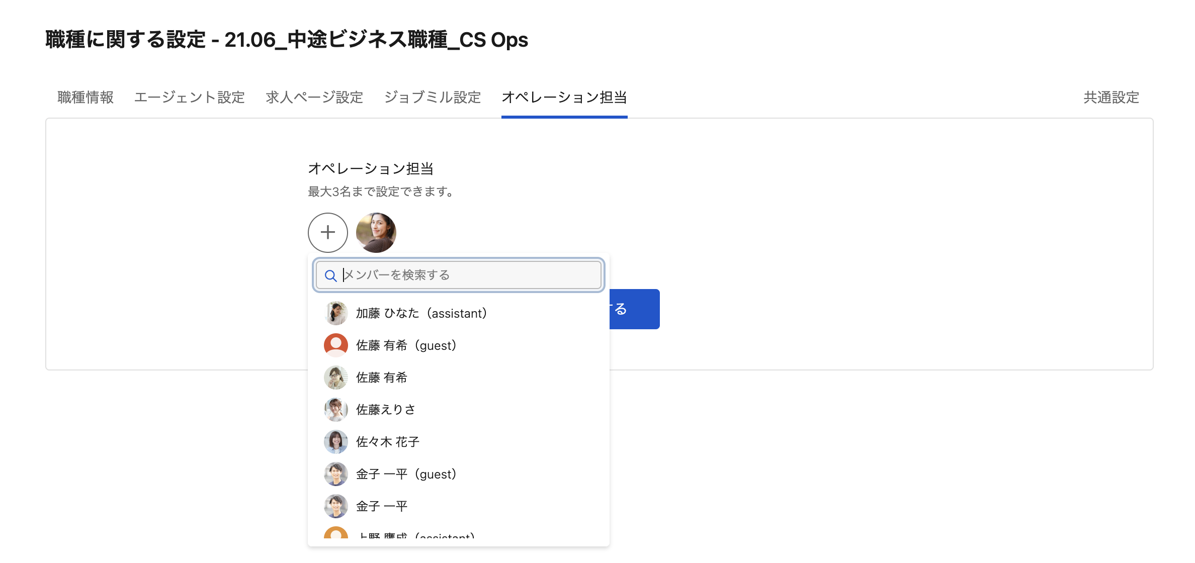 当該職種の応募のオペレーション担当として、ユーザーを最大3名まで指定する