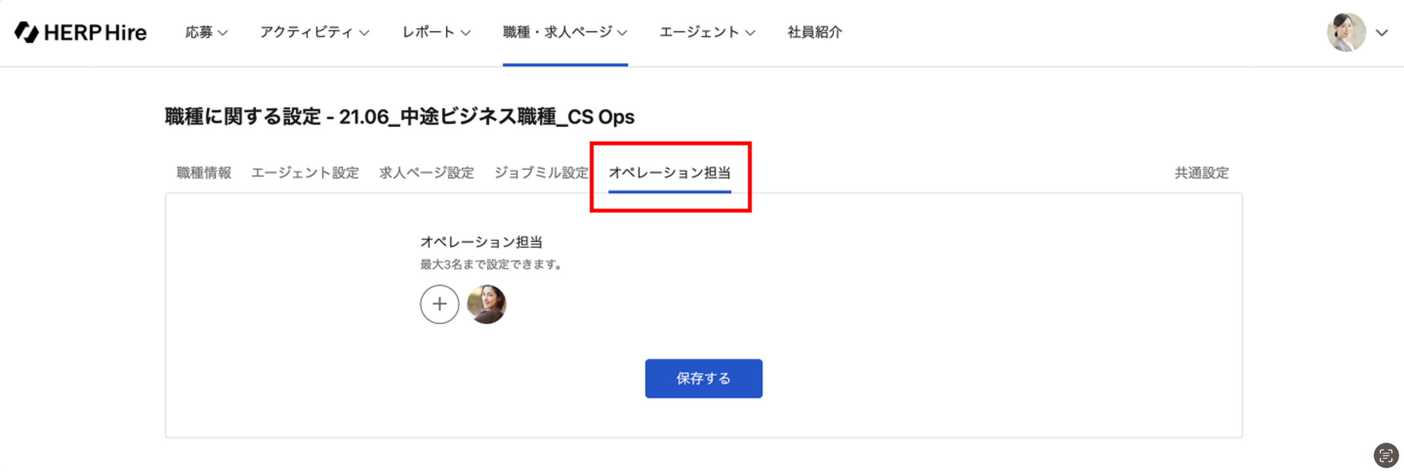 ここで設定したユーザーを、その職種の応募がHERP Hireに追加されたときに、オペレーション担当として自動で設定することができます。
