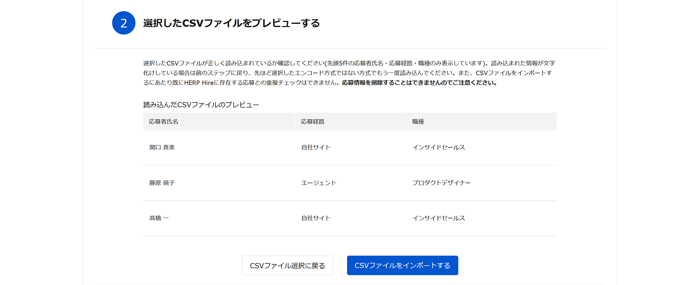 必須項目に空白の行がある場合や「募集職種」列に HERP Hire 上で作成されていない職種がある場合はエラーが発生し応募情報が取り込めません。ご注意ください。