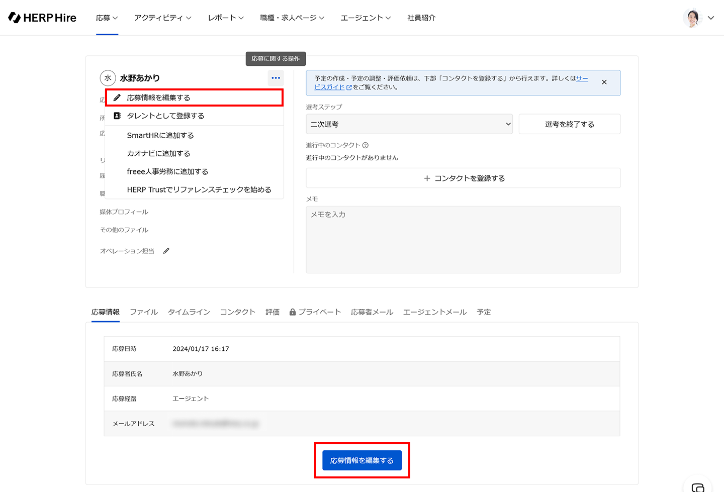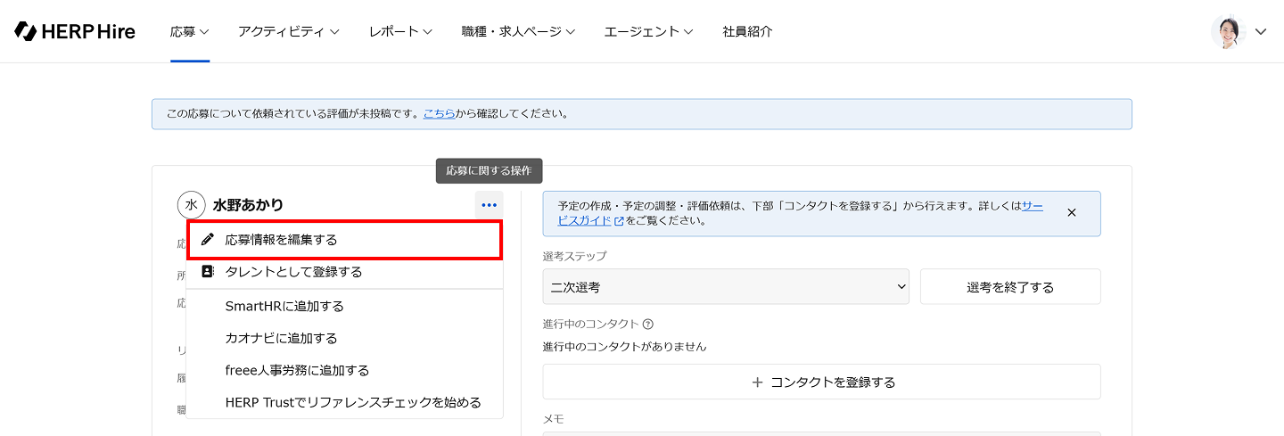 応募詳細で応募者氏名の右部にある「…」をクリックして、「応募情報を編集する」をクリックします。