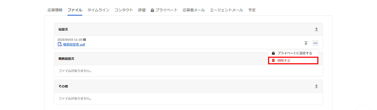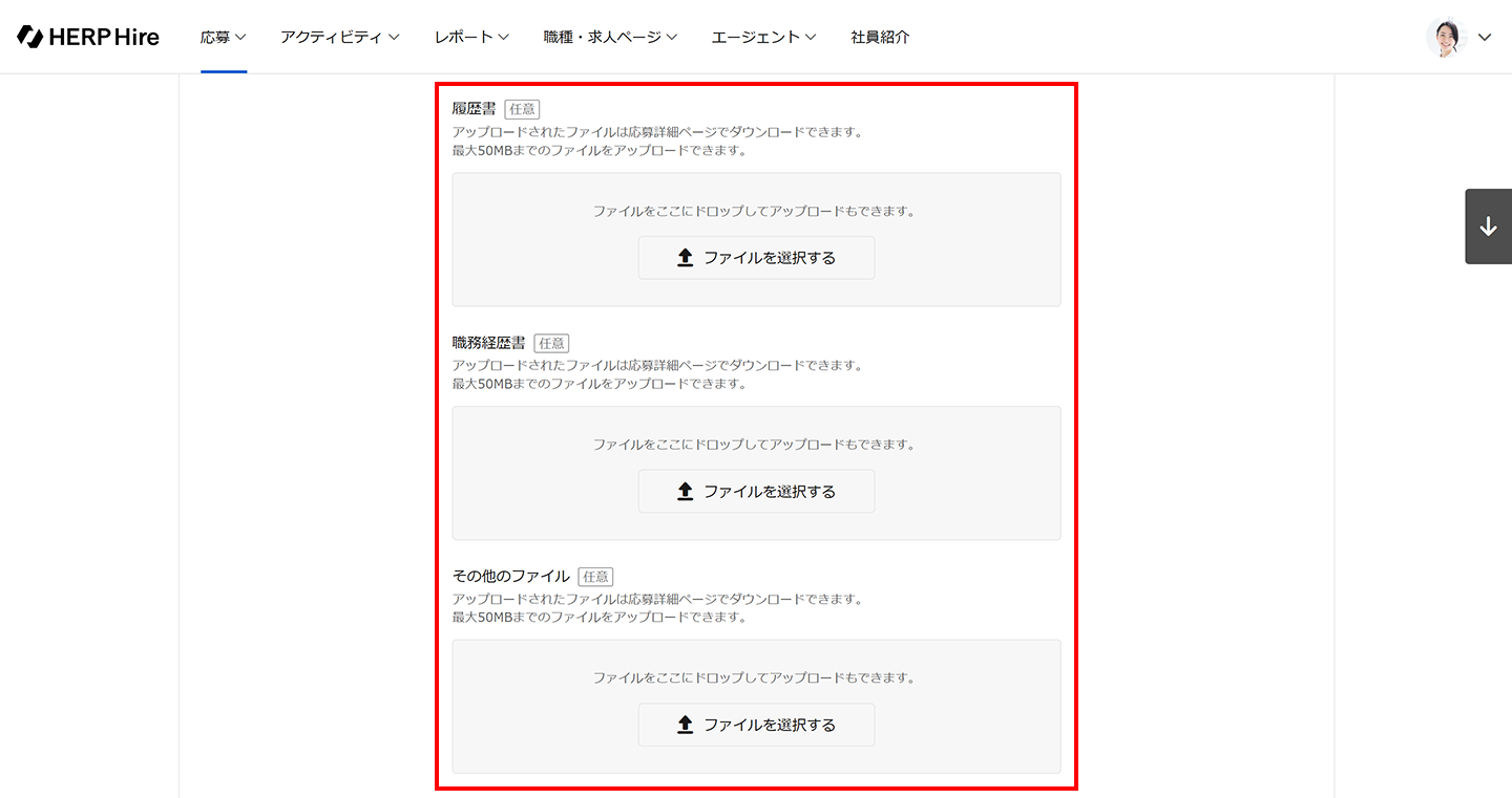 ファイルは「履歴書」「職務経歴書」「その他」(ポートフォリオなど)をそれぞれ複数ファイルアップロードできます。