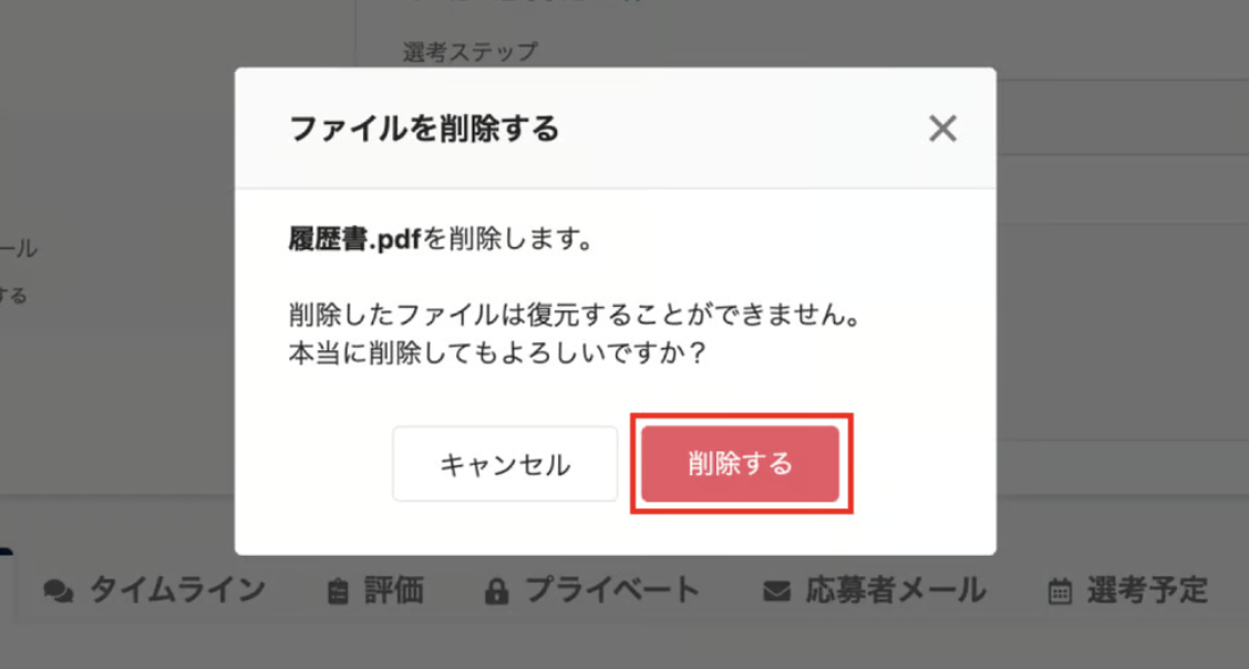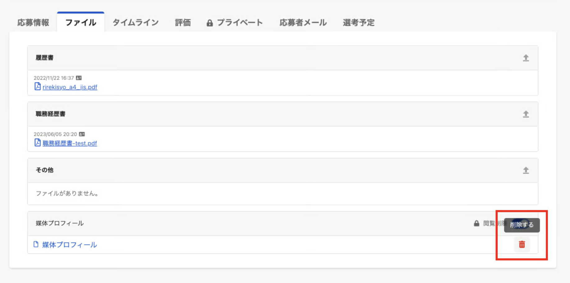 応募詳細のファイルタブの「媒体プロフィール」にホバーし、ゴミ箱ボタンをクリック
