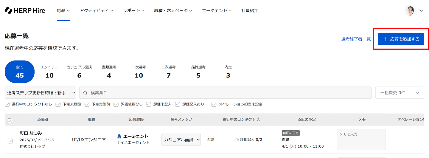応募一覧で「応募を追加する」をクリックして、新しい応募の追加を表示します。