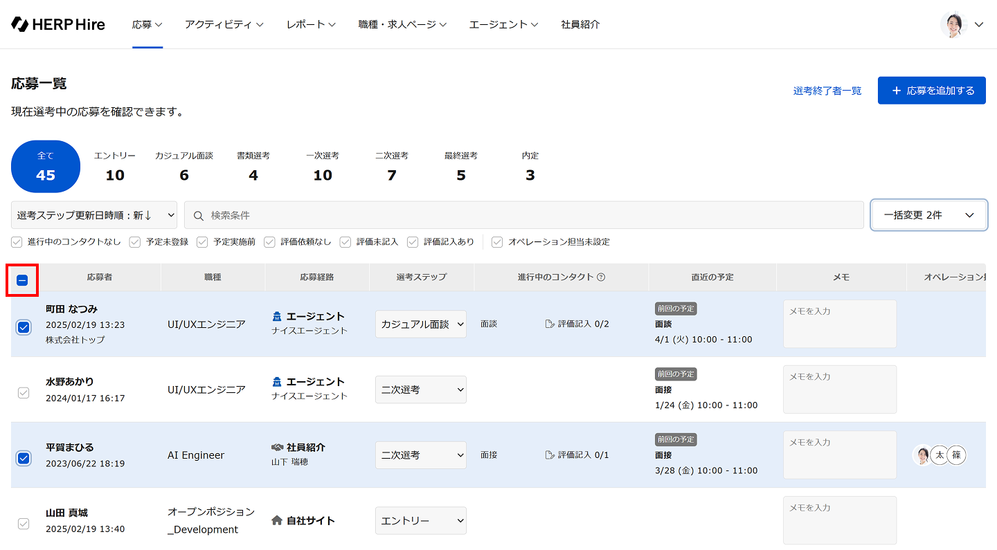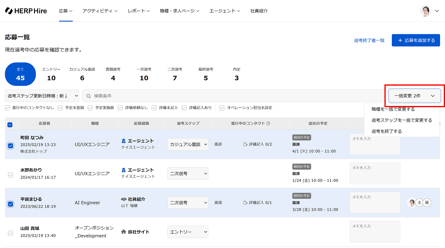 この記事では応募一覧で応募の職種を変更する方法をご案内します。応募一覧では、複数の応募の職種をまとめて変更することも可能です。