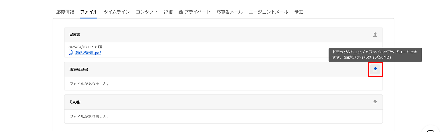 応募詳細から「ファイル」タブをクリックします。右側のアイコンをクリックするとファイルのアップロードができます。