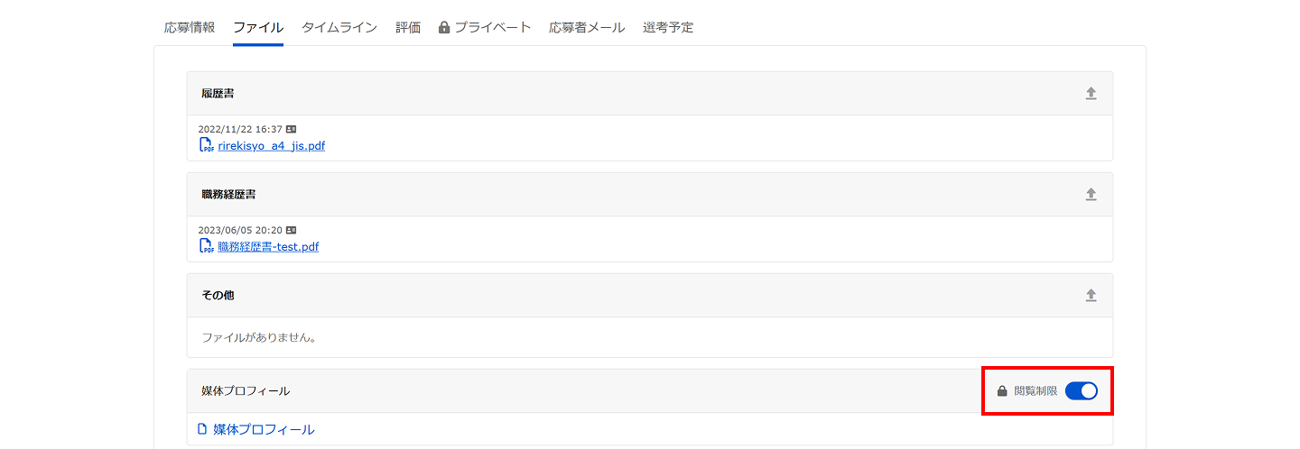 応募詳細画面の「ファイル」タブで、媒体プロフィール横の「閲覧制限ON/OFF」を切り替えることによってゲストへの閲覧を制限することができます。