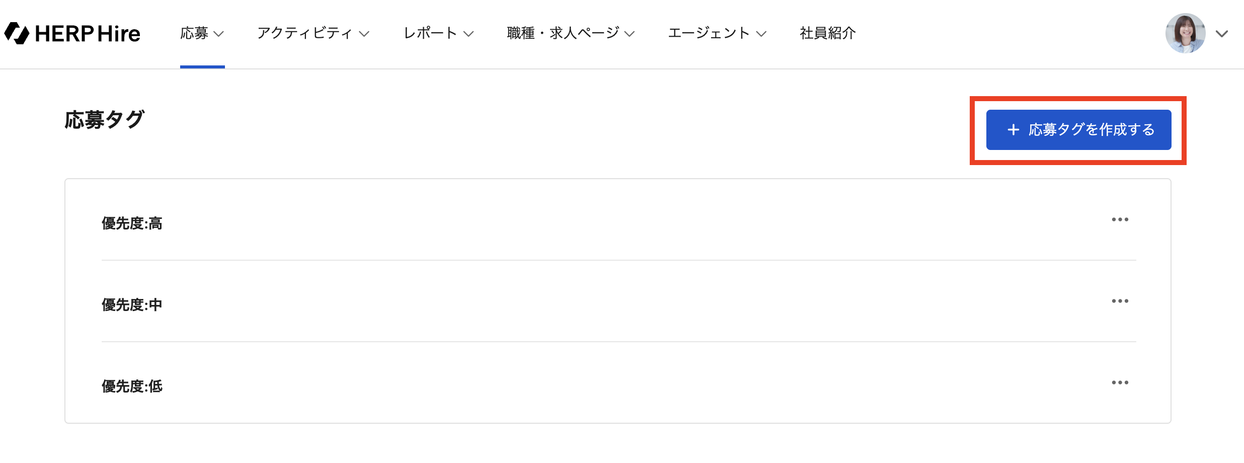 タグ自体は、応募タグ画面から作成・編集・削除します。応募タグ画面は、メニューのうち応募 > 応募タグから遷移することができます。
