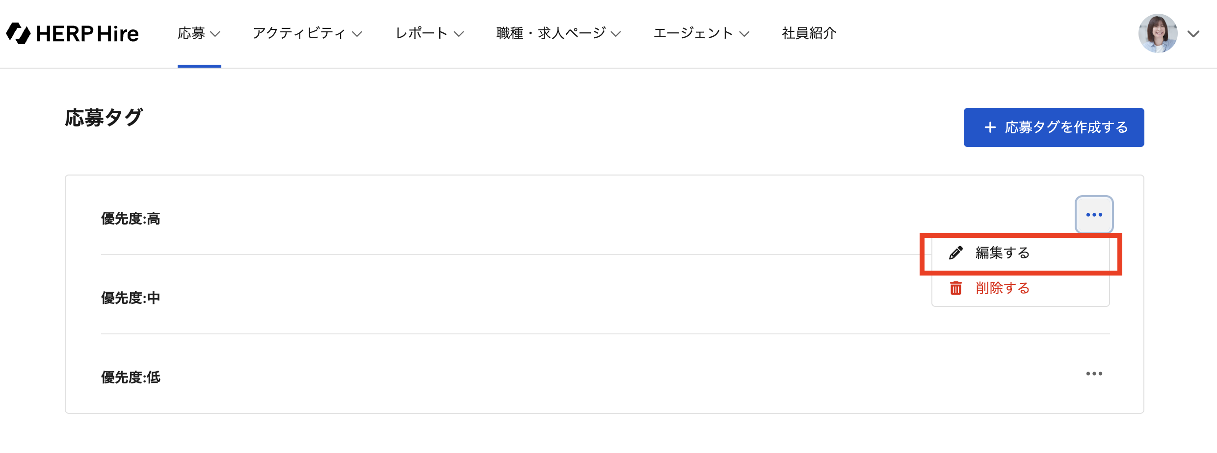 既存の応募タグを編集する場合には、編集したいタグの「編集する」をクリックする