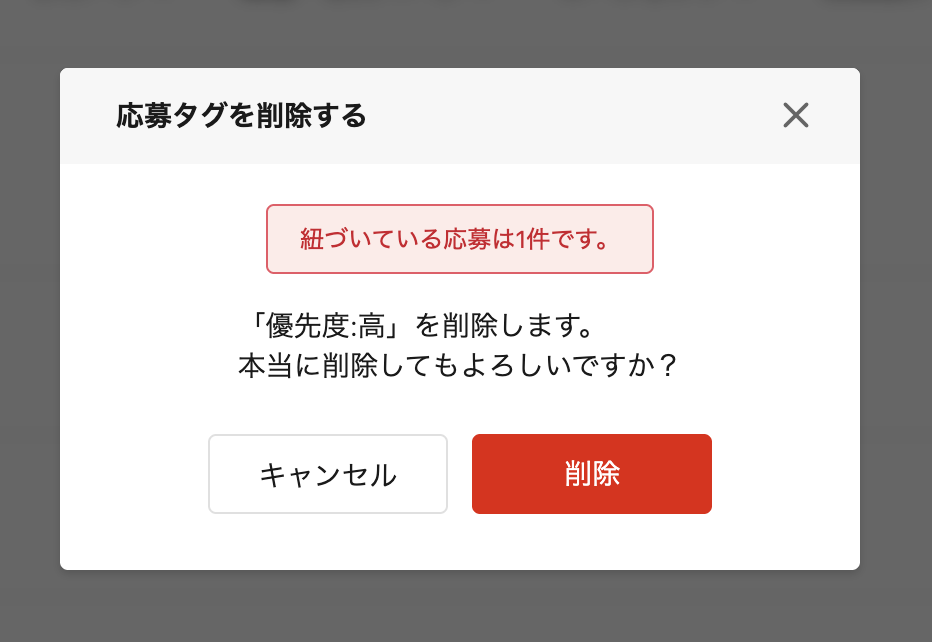 削除時には、必ず該当の応募タグに紐づいている応募件数が表示されるため、問題ないことを必ず事前に確認のうえ「削除」をクリックする
