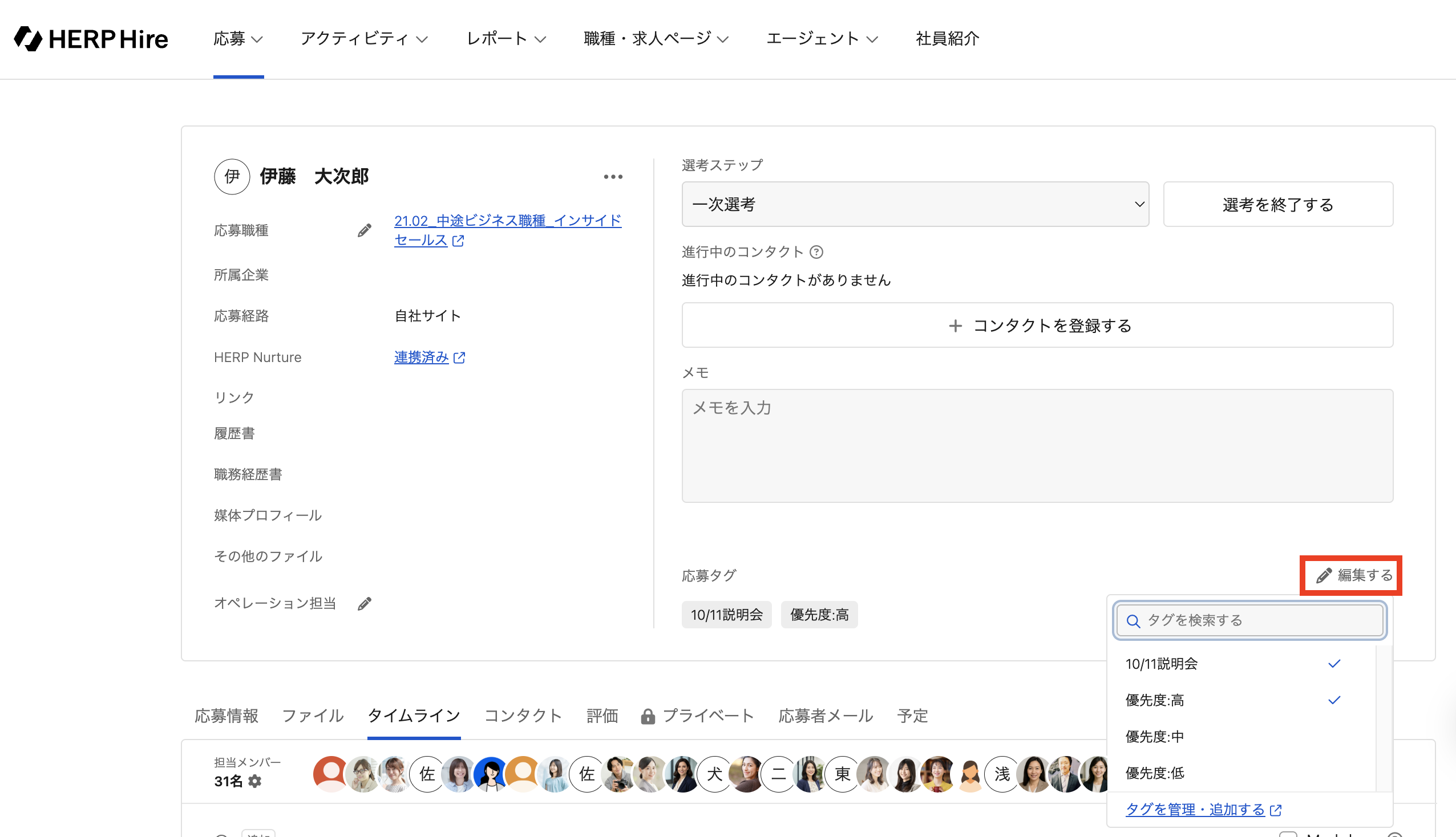 該当の応募詳細画面を開き、画面右上部分にある応募タグの「編集する」をクリックする