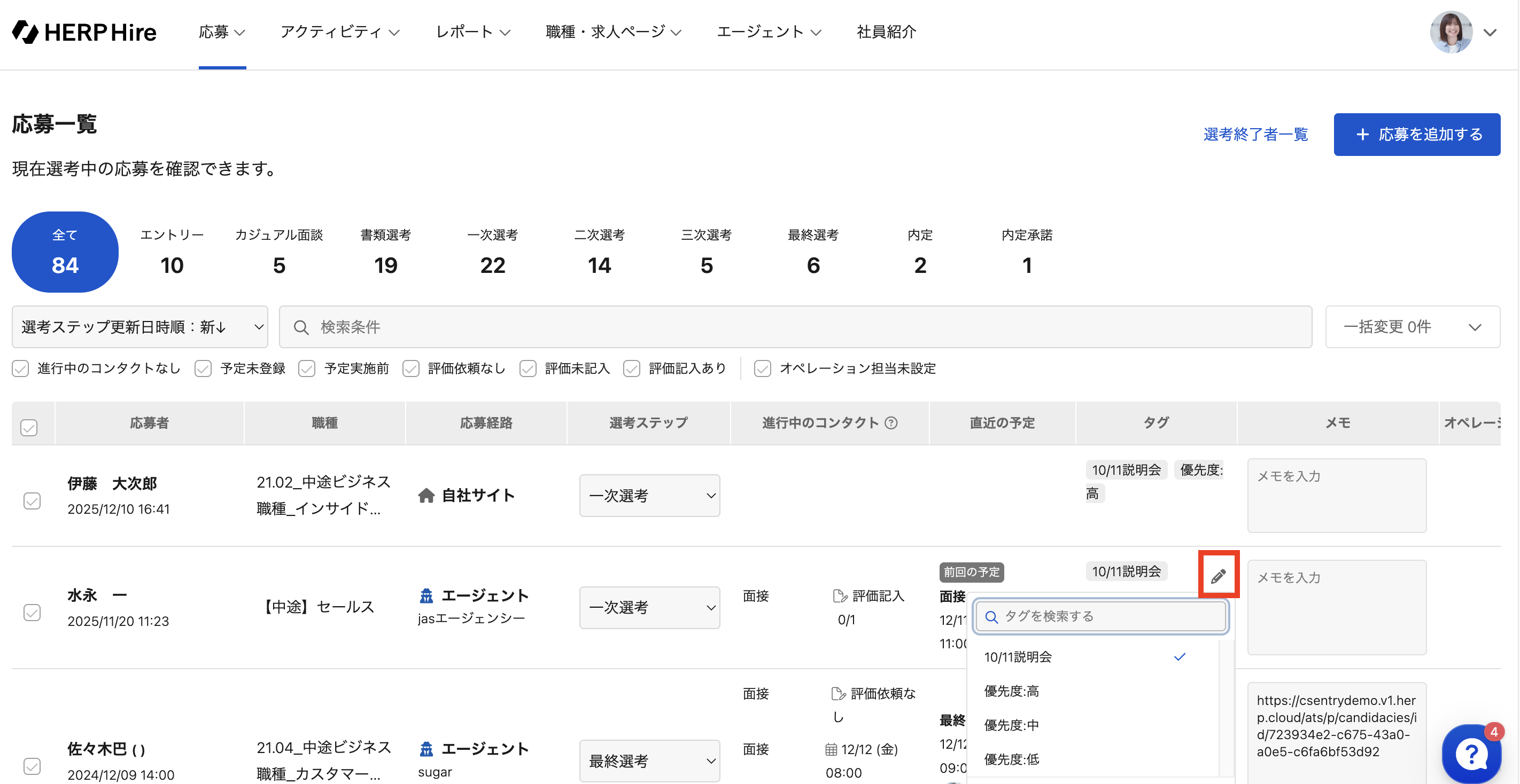 応募一覧の「タグ」の列にカーソルを合わせると、鉛筆マークが表示されるのでそれをクリックする
