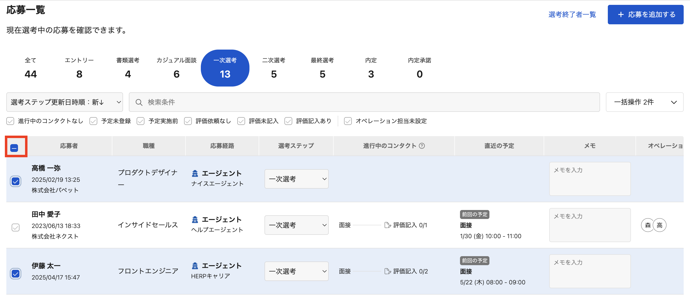 ※最上部のチェックボックス(図中の赤枠)にチェックを入れると表示している応募者全員の選択が可能です