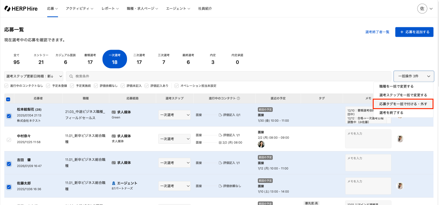 「応募タグ一括で付ける・外す」をクリックし、追加または取り外したい応募タグを選択する